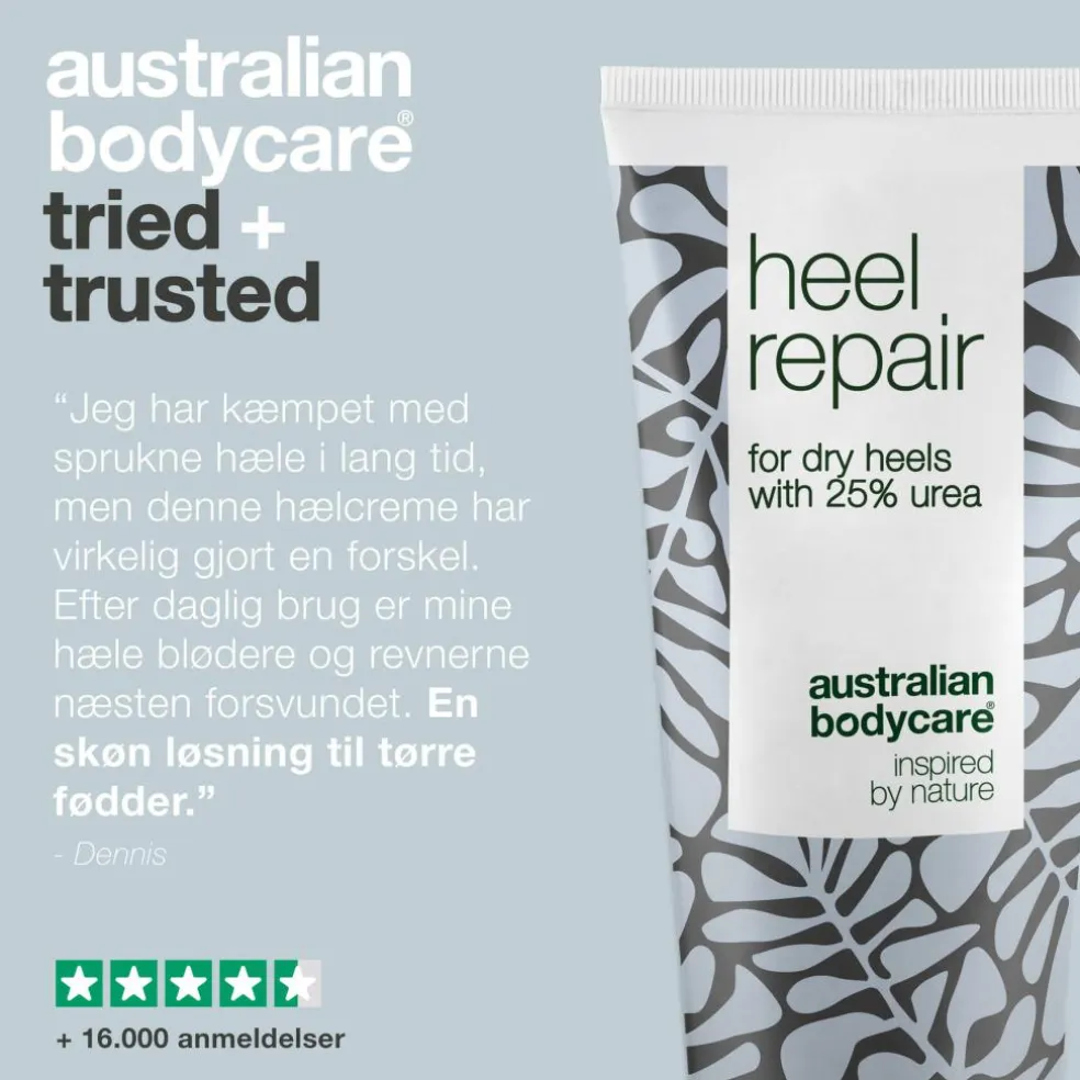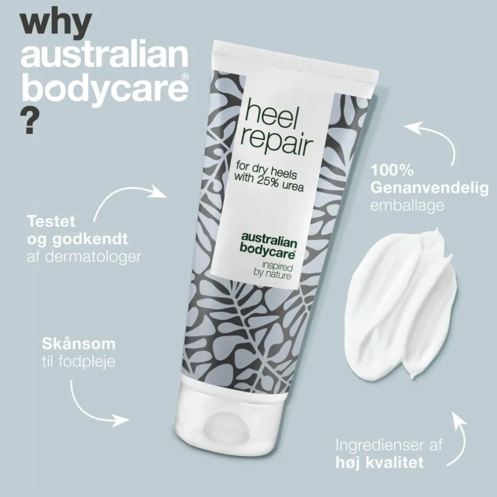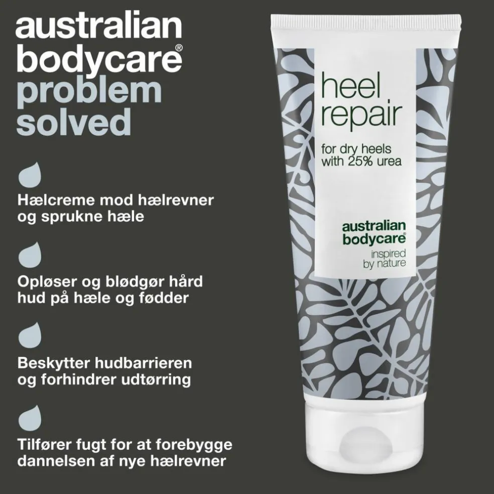 Heel Repair kan bruges forebyggende – eventuelt i kombination med fodcremen Foot Cream fra Australian Bodycare. Smør med fod- eller hælcremen dagligt for at forhindre, at den tørre og hårde hud vender tilbage.