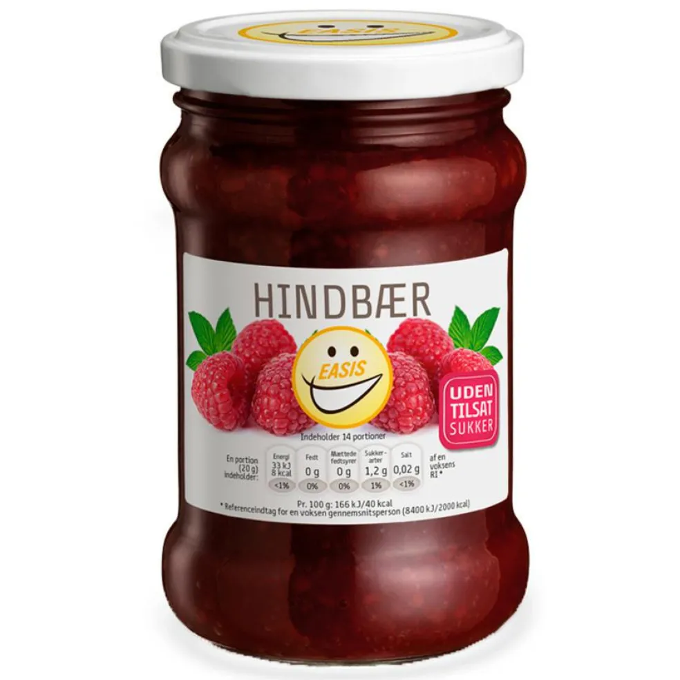 EASIS Hindbær Marmelade giver dig den gode, lækre smag af nyplukkede hindbær. Nyd den på brød, yoghurt eller til kager og desserter. Den indeholder hele 80% færre kalorier end traditionel marmelade, og så er den ikke tilsat sukker. Fremstillet af 45 g frugt pr. 100 g.
