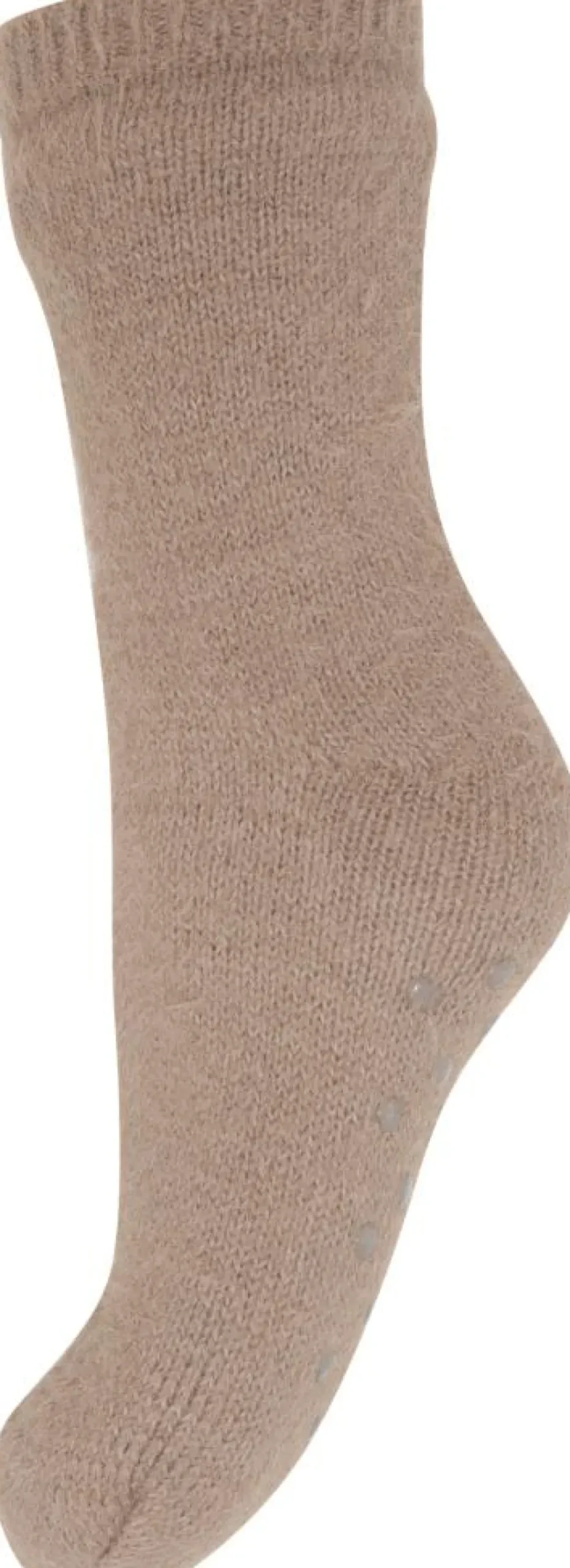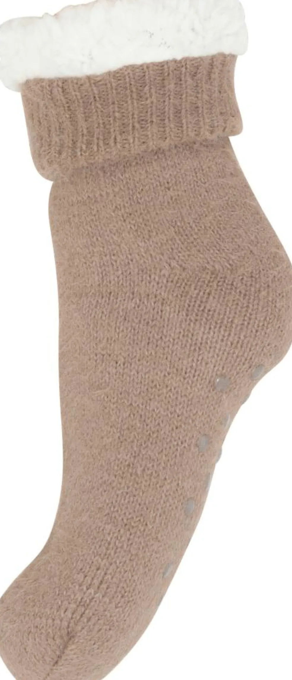 Bløde og varme hjemmesokker med foer i brun med skridsikre dutter. 70% Polyacryl, 30% Polyamid