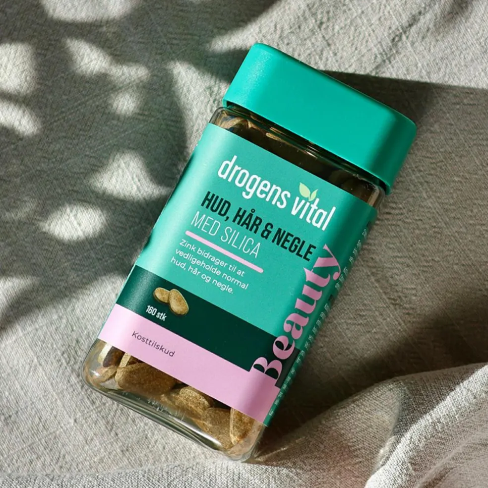 Drogens Vital Hud, Hår & Negle er sammensat af vitaminer, mineraler, ølgær samt planten agerpadderok, der indeholder silica.