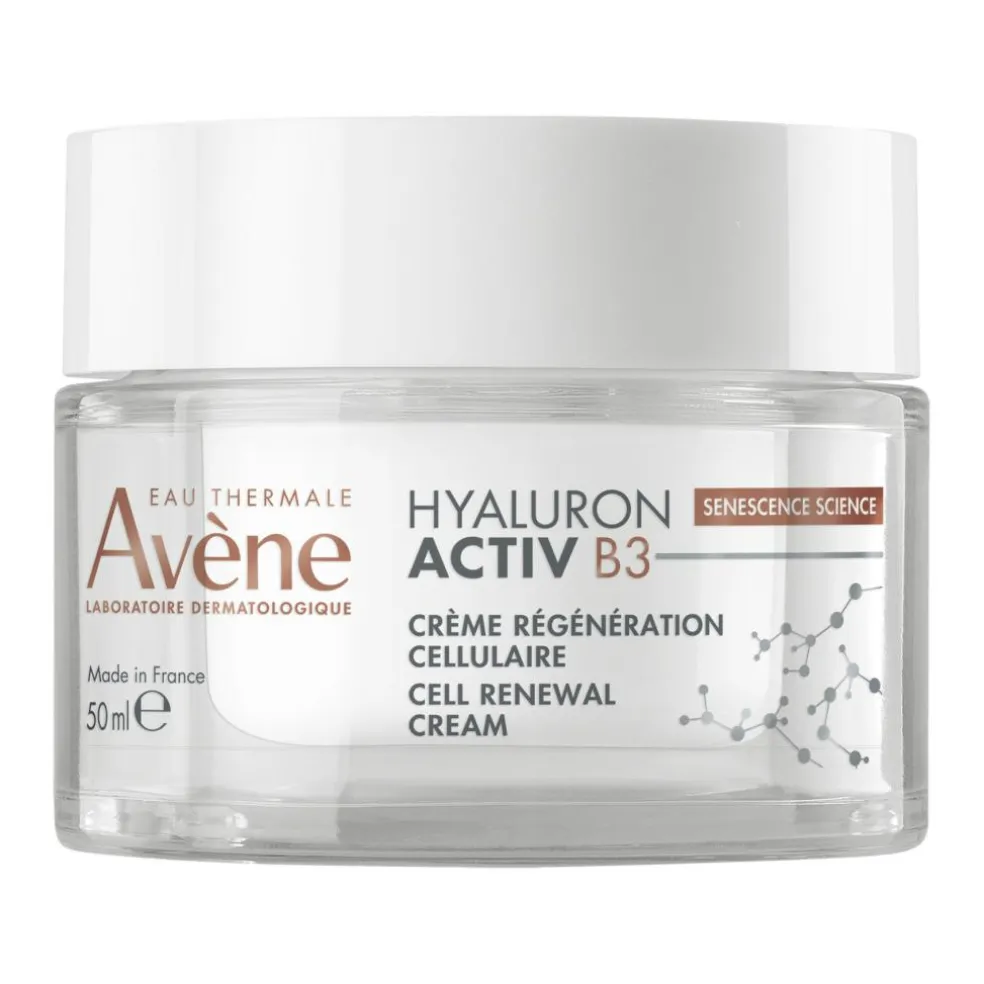 Avène Hyaluron Activ B3 Anti-Age Cell Renewal Cream er en anti-age dagcreme, der stimulerer cellefornyelsen og udglatter synlige alderstegn. Formlen kombinerer 6% niacinamid og to typer hyaluronsyre (høj og lav molekylær vægt), som arbejder i dybden for at booste hudens egenproduktion af hyaluronsyre og forlænge cellernes levetid, så fine linjer og rynker mindskes og hudens fylde genoprettes. Niacinamid bidrager samtidig til en mere ensartet hudtone og forbedrer hudens elasticitet.