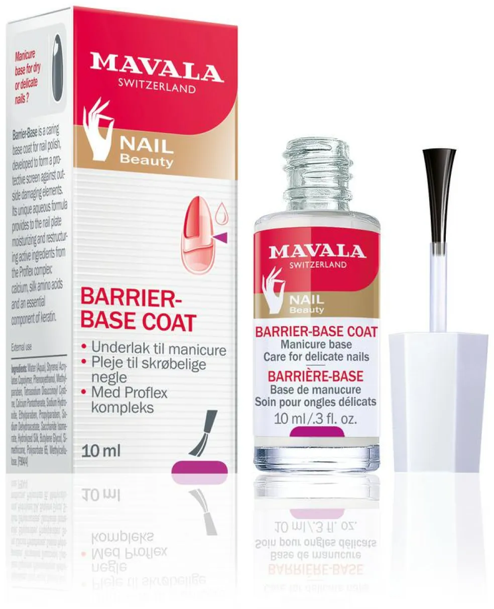 Plejende underlak til skrøbelige negle. Tørre, skrøbelige negle er sarte over for rengøringsmidler, chok, slitage og især vand. Mavala Barrier Base Beskyttende Underlak er udviklet specielt til tørre, skrøbelige negle. Underlakken forebygger at neglene dehydrerer, flosser og skaller – og hjælper samtidig med at genskabe neglens fleksibilitet. Den vandige formulering tilfører fugt til neglepladen og aktive ingredienser fra Proflex komplekset i form af calcium, silkeaminosyre og vigtige komponenter fra keratin. Barrier Base Beskyttende Underlak danner en beskyttende barriere mellem neglepladen og neglelakken, og beskytter dermed mod gulning samtidig med at den fremmer neglens evne til at optage neglelakken. Anvendelse: Læg et tyndt lag underlak på hele neglepladen – neglene skal være helt rene. Lad underlakken tørre inden du fortsætter din manicure. Barrier Base er en underlak og skal afsluttes med neglelak eller overlak.