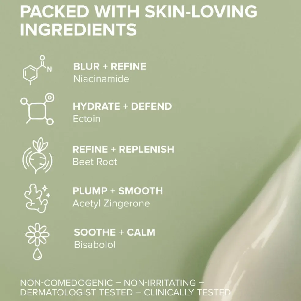 Indeholder niacinamid, ectoin og rødbede, der beskytter huden og forbereder den – makeup kan tilvælges.