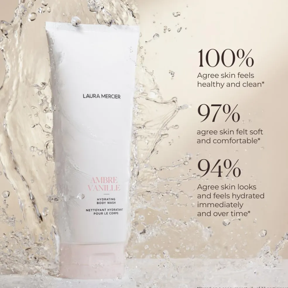 Ambre Vanillé Hydrating Body Wash fra Laura Mercier er en luksuriøs brusegel med cremet skum, der renser nænsomt og giver op til 10 timers fugt.