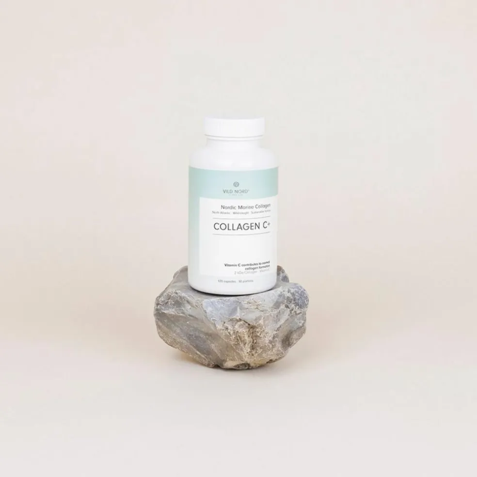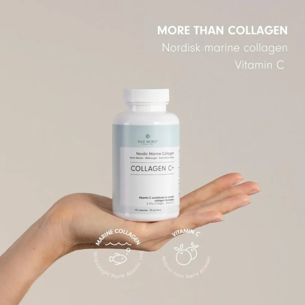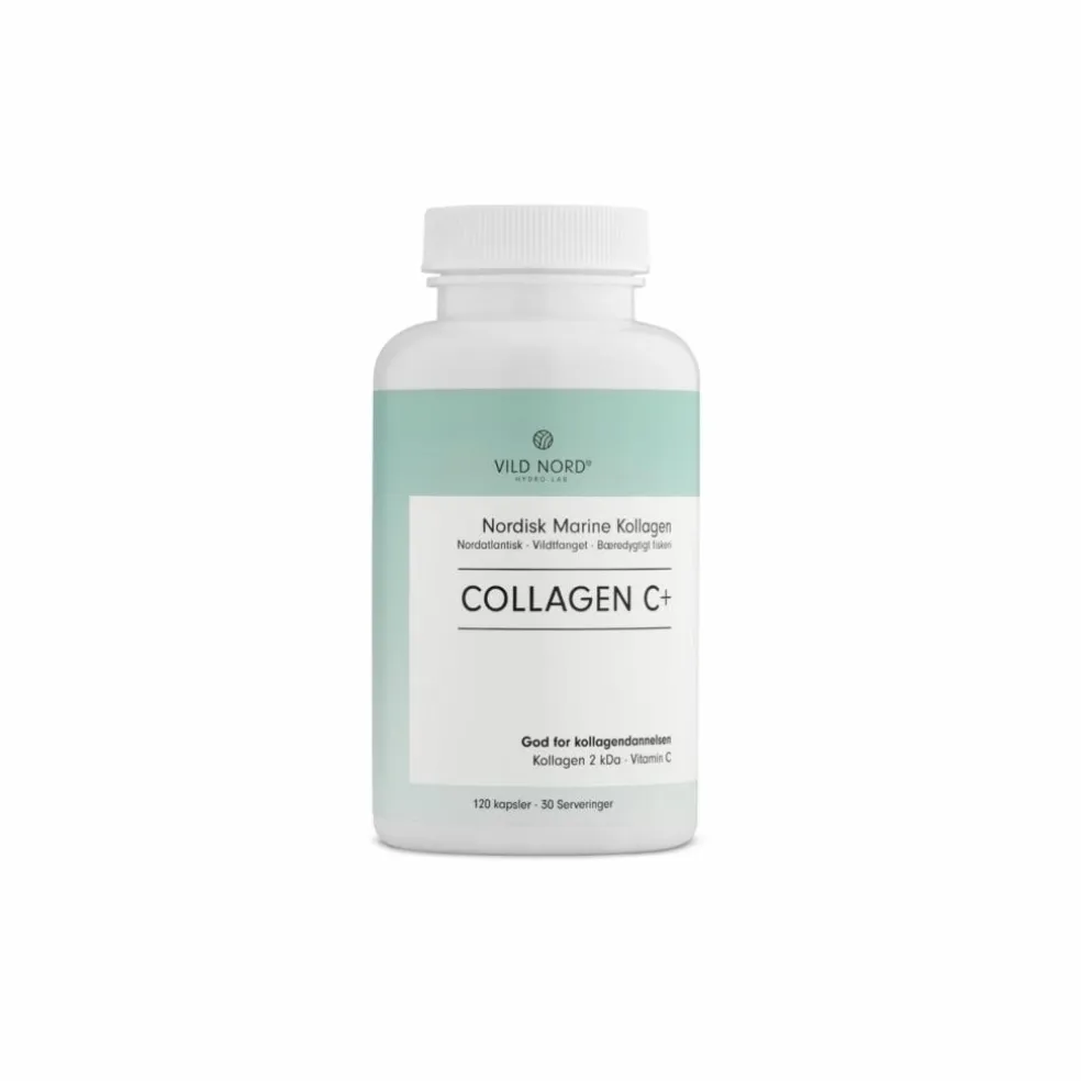 Collagen C+ kapsler indeholder 2 kDa kollagen fra vildtfanget nordatlantisk torsk og vitamin C, som er god for dannelsen af kollagen.