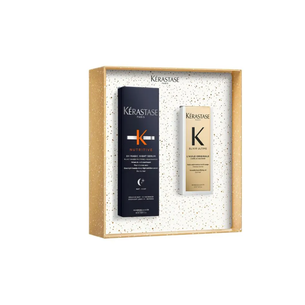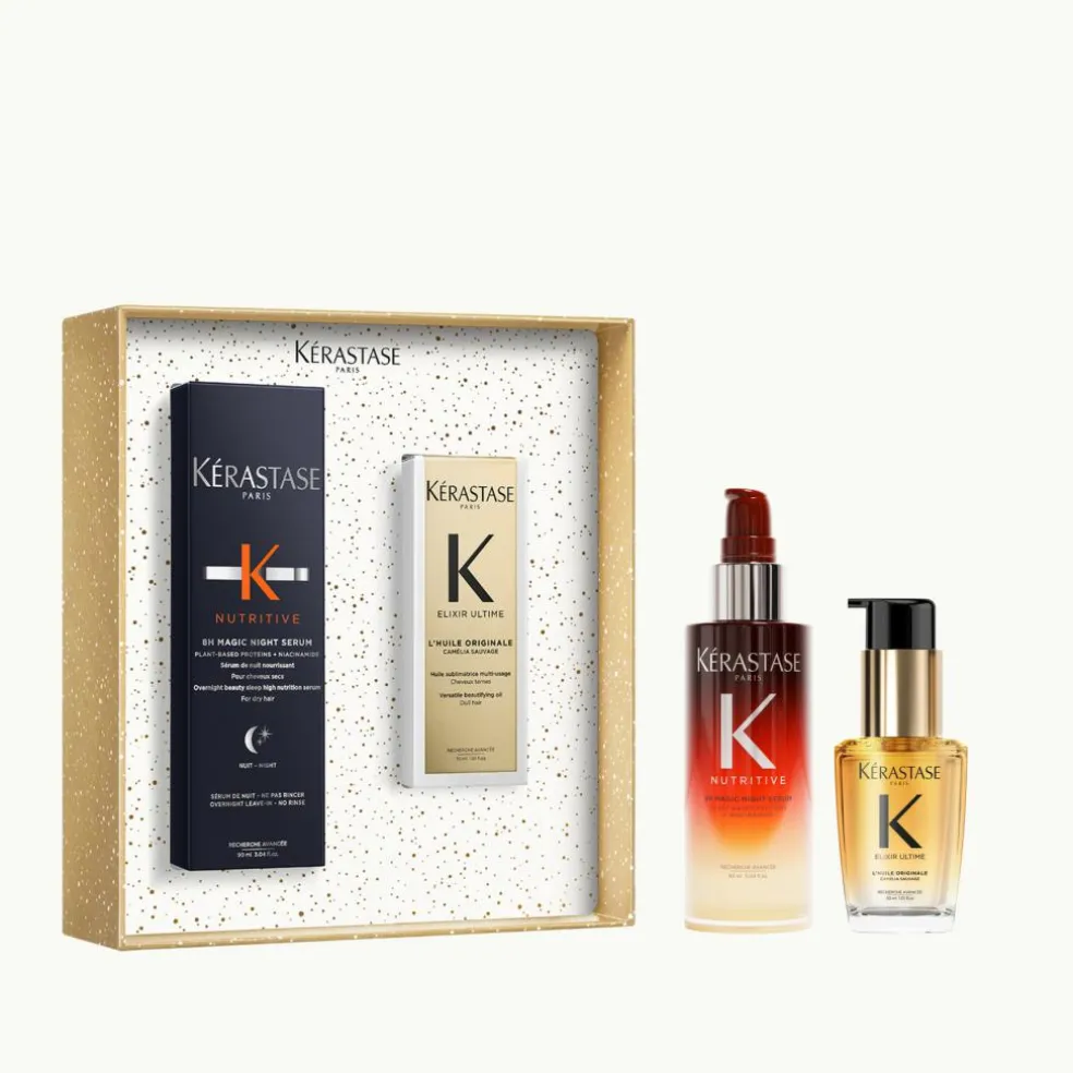 Dette Holiday Set indeholder to af dine Kérastase-favoritter Nutritive 8H Magic Night Serum Leave-In & Elixir Ultime L’Huile Originale Hair Oil.