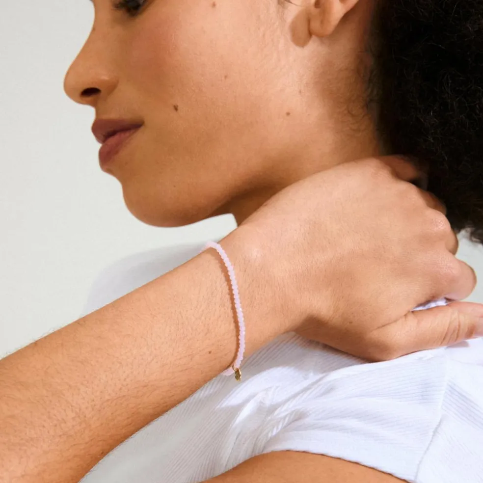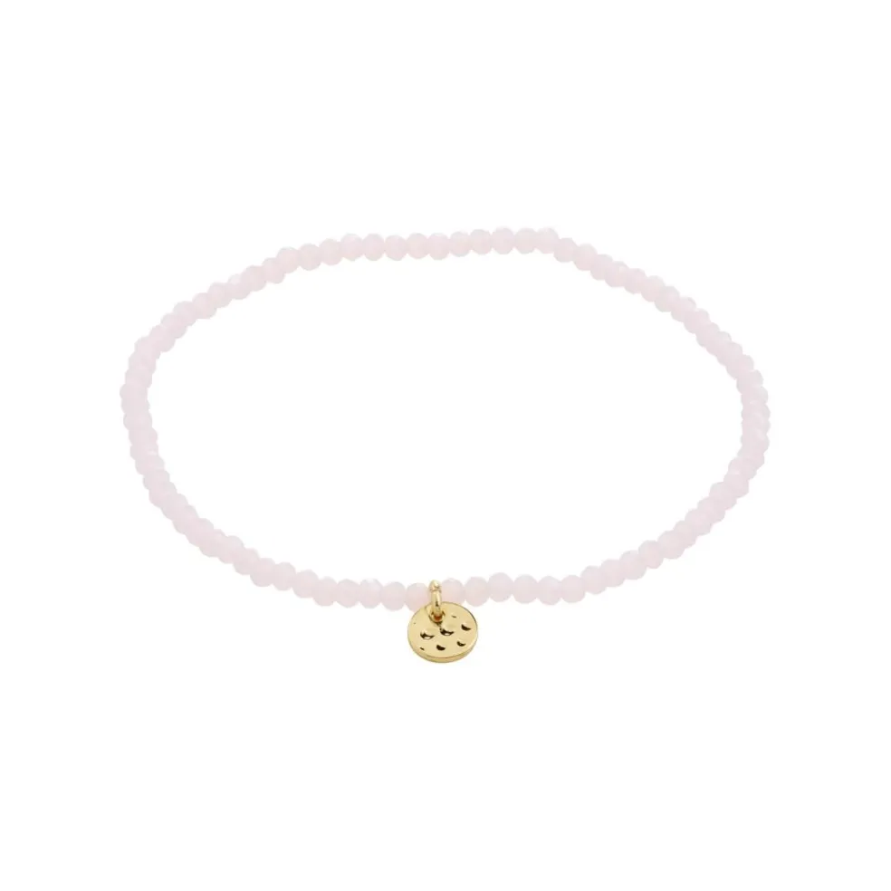 Armbåndets rosa facetterede glasperler og diskrete guldbelagt Pilgrim logo, fanger lyset og skaber attention til dit look.