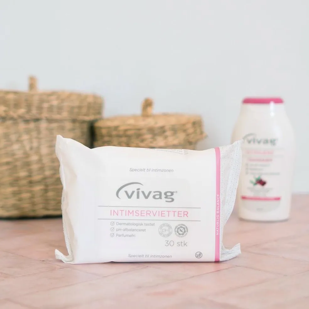 Daglig velvære: Vivag Intimservietter 30stk er skånsomme ogekstra milde, velegnet til vask af den intime zone. Servietterneer dermatologisk testet, parfumefri og fugtighedsbevarende.Intimservietterne har en lav pH-værdi specielt tilpasset underlivet.Giver dig en forfriskende og ren følelse. Intimservietterneer perfekt til at tage med på rejser og kan benyttes ved menstruationeller let urininkontinens.
