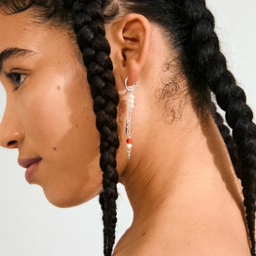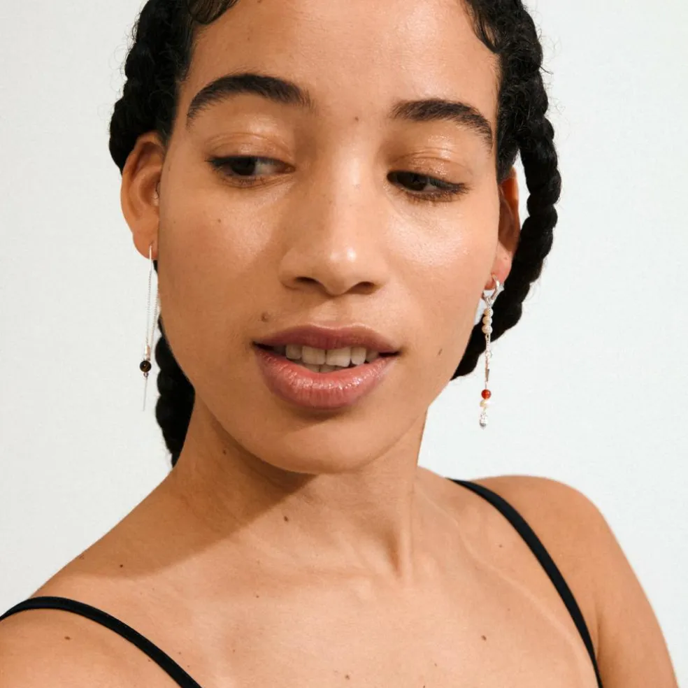 De levende vedhæng af Ametyst, Aventurine, Tiger Eye og ferskvandsperler tilfører en luksus-boho vibe med en rå, kunstnerisk kant. Et sæt øreringe du kan bruge hver for sig eller som en del af et ear stacking set, der komplementerer et bohemian outfit – klar til både spontane eventyr og hverdagsmagi!
