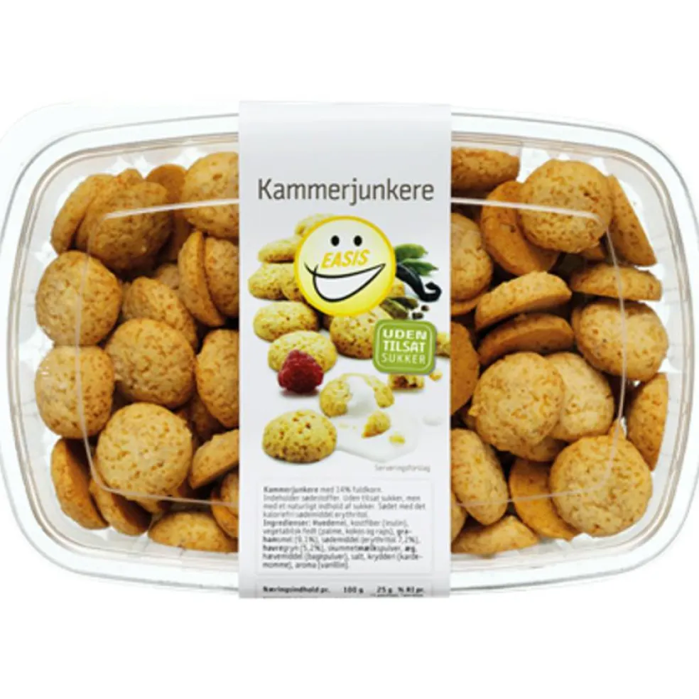 EASIS Kammerjunkere er uden tilsat sukker. Til gengæld indeholder de masser af fibre og fuldkorn bl.a. fra grahamsmel og havregryn. De har en sød, krydret smag af vanilje og kardemomme og så er de lidt mindre end traditionelle kammerjunkere og dermed mere mundrette. Prøv de knasende sprøde kammerjunkere oven på din favoritkoldskål..