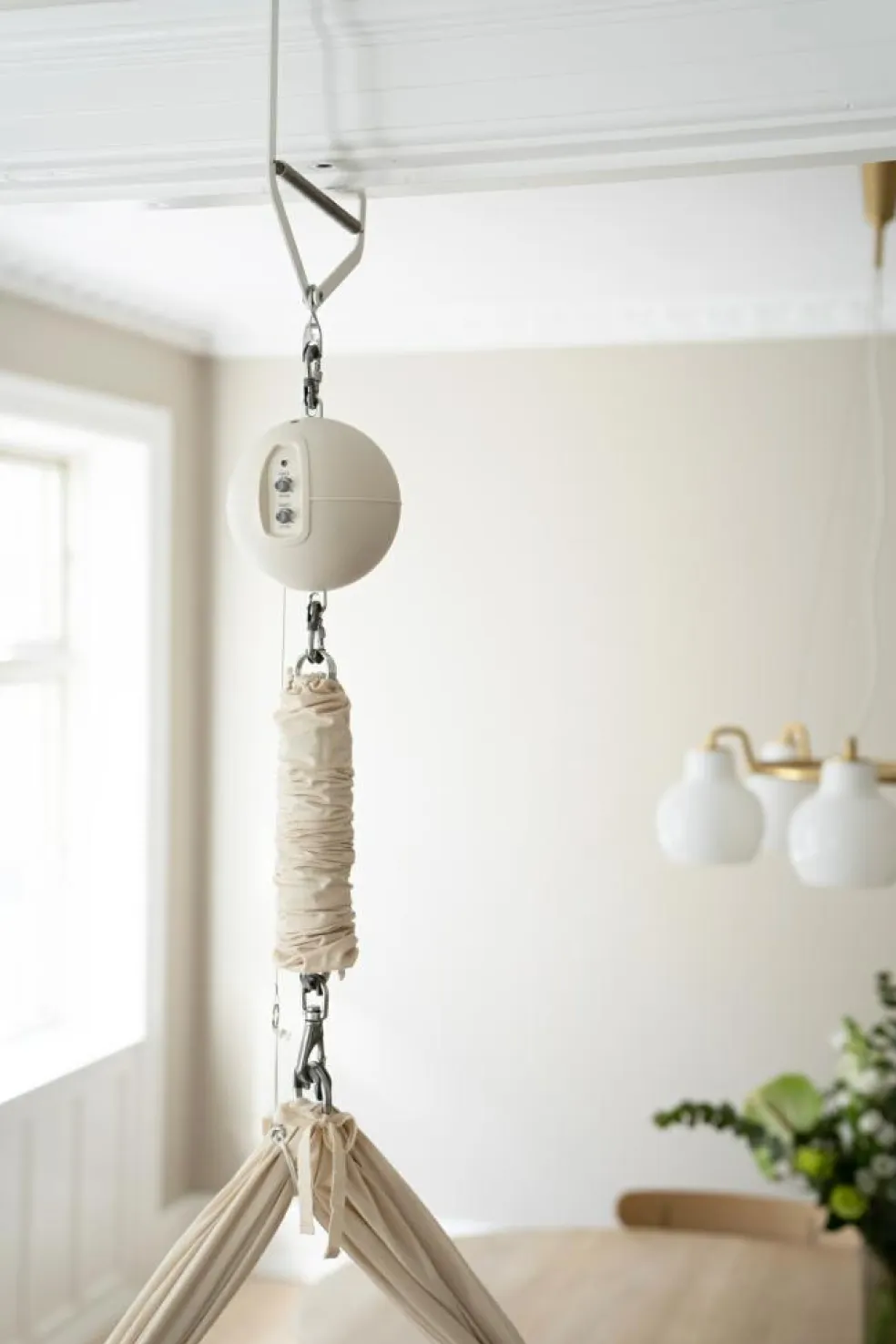 Det kræver min. 220 cm fra toppen af dørkarmen til gulv for at have både slyngevugge/vugge og motor hængende.