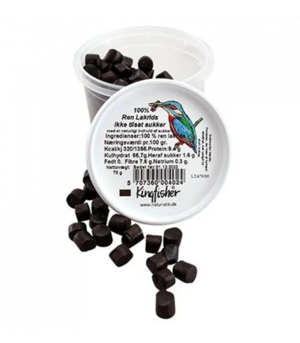 100 % Ren lakrids 75 g. Ikke tilsat sukker, med et naturligt indhold af sukker. Kingfisher rå-lakrids nydes i ganske små stykker.