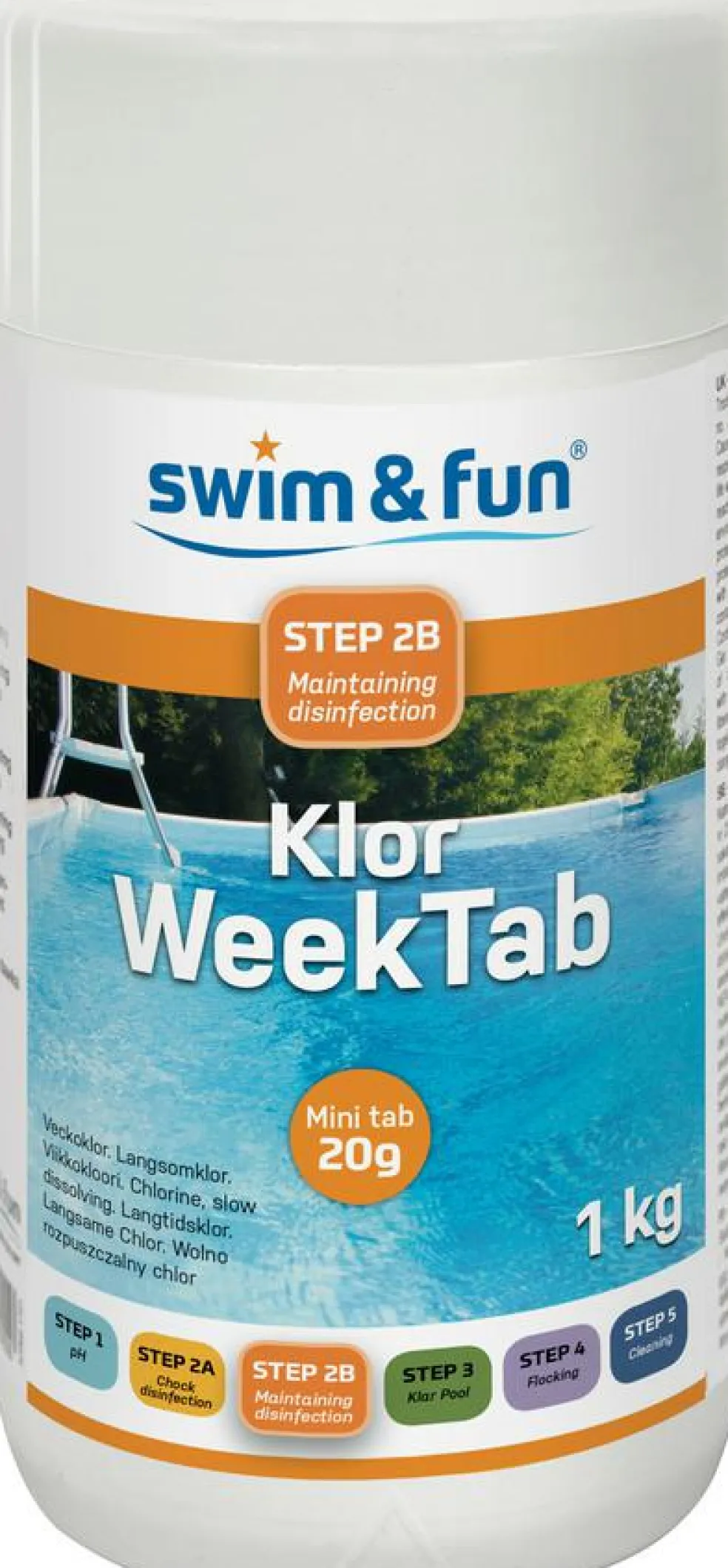 Klor WeekTab langsom-klortabletter leveres i praktisk plastbeholder med børnesikret låg. Beholderen er påtrykt udførlig brugsanvisning på de nordiske sprog samt engelsk.