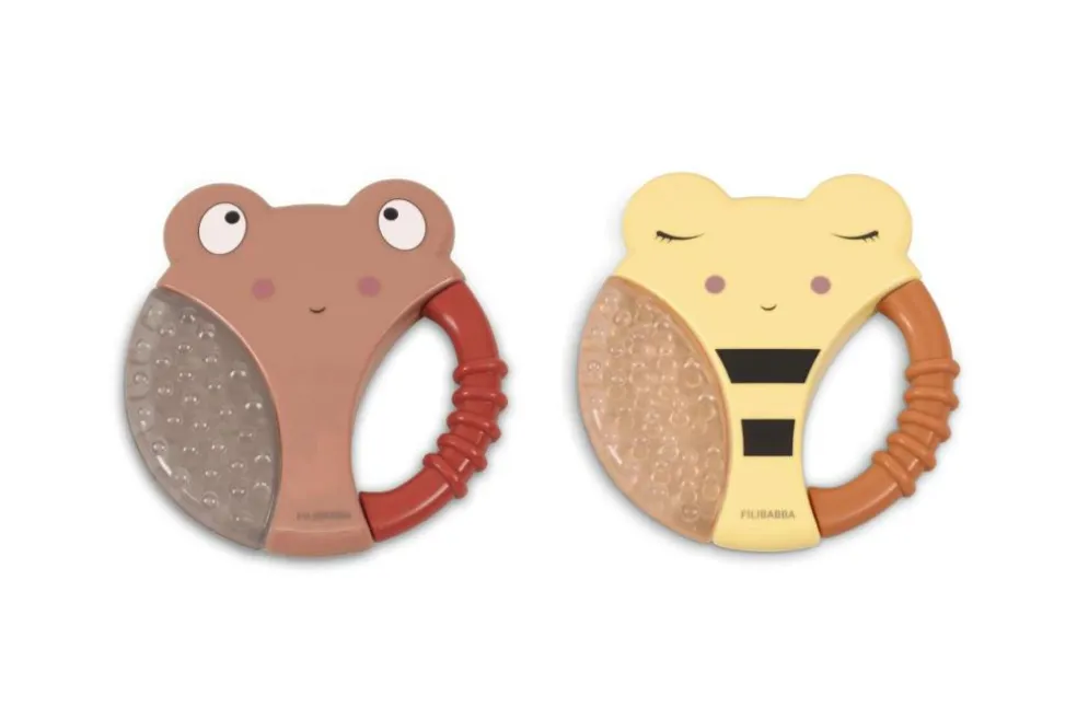 Vores kølebideringe er formet som en lille bi og en nuttet larve. De er fyldt med sterilt vand og lindrer dit barns ømme gummer ved tandfrembrud.