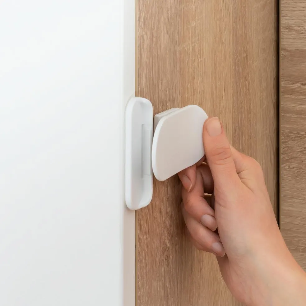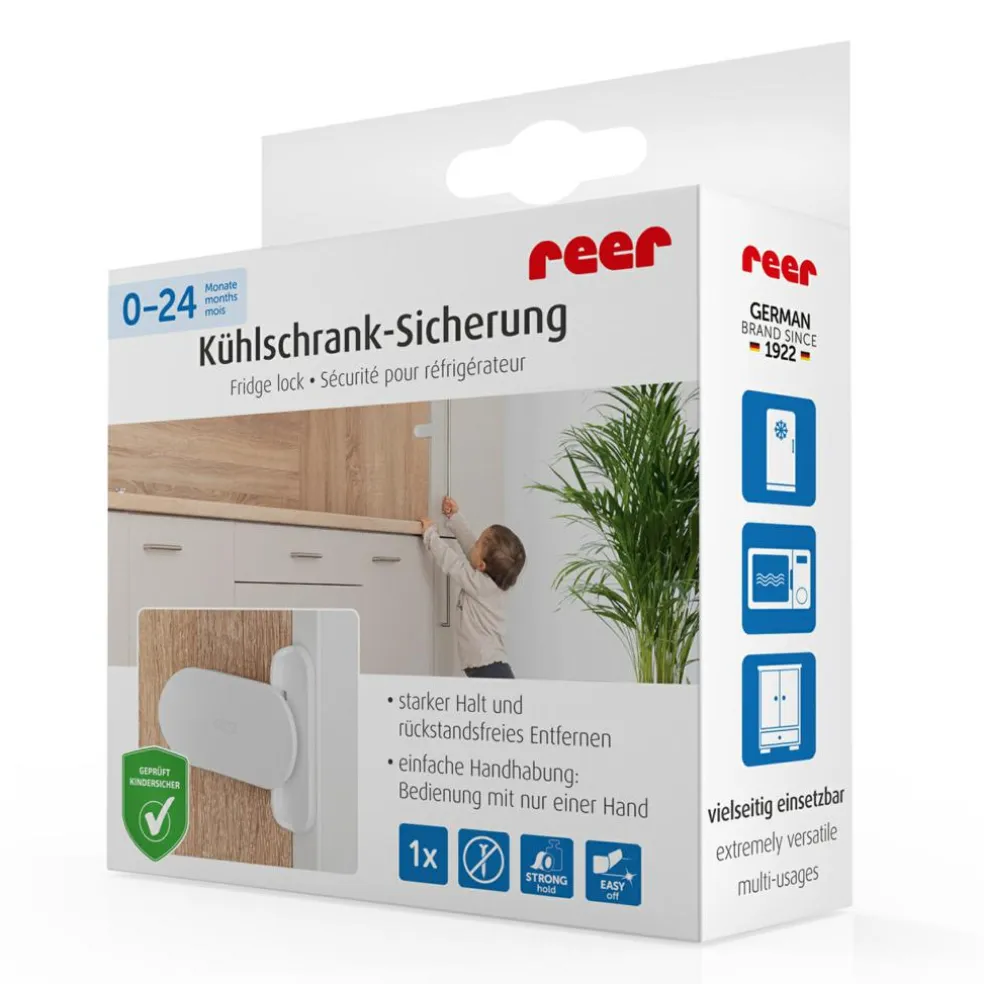 Med denne køleskabslås kan man børnesikre køleskab, mikroovn, skydedøre m.m.