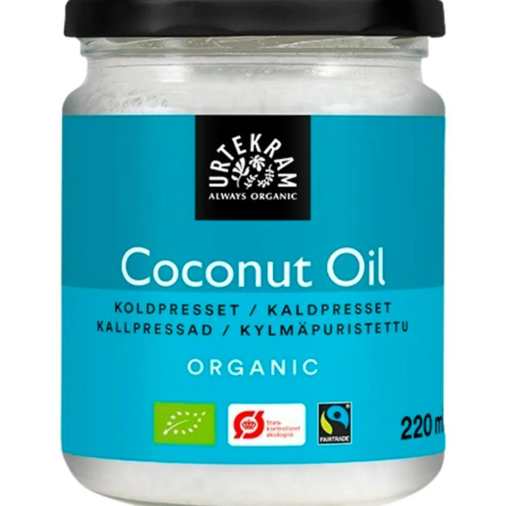 Urtekram kokosolie er koldpresset og økologisk. Kokosnødderne i Urtekram kokosolie koldpresses, hvilket giver en mild duft og frisk smag af kokos.