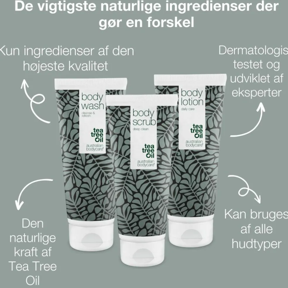3 kropsprodukter til eksfoliering af bumser på ryggen og ballerne. Eksfolieringspakken fra Australian Bodycare indeholder shower gel, body lotion og body scrub og modvirker bl.a. uren hud på ryggen.