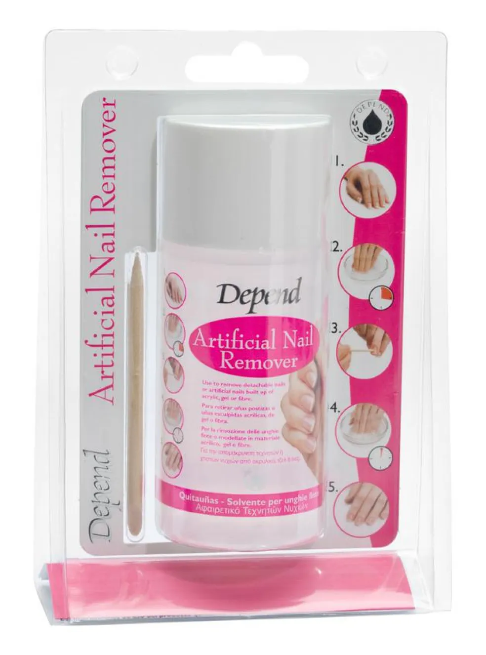 Kontroller først dette hos din leverandør af negle/akryl/gel. Alle kunstige negle og modelleringsgeler fra Depend kan opløses med denne remover.