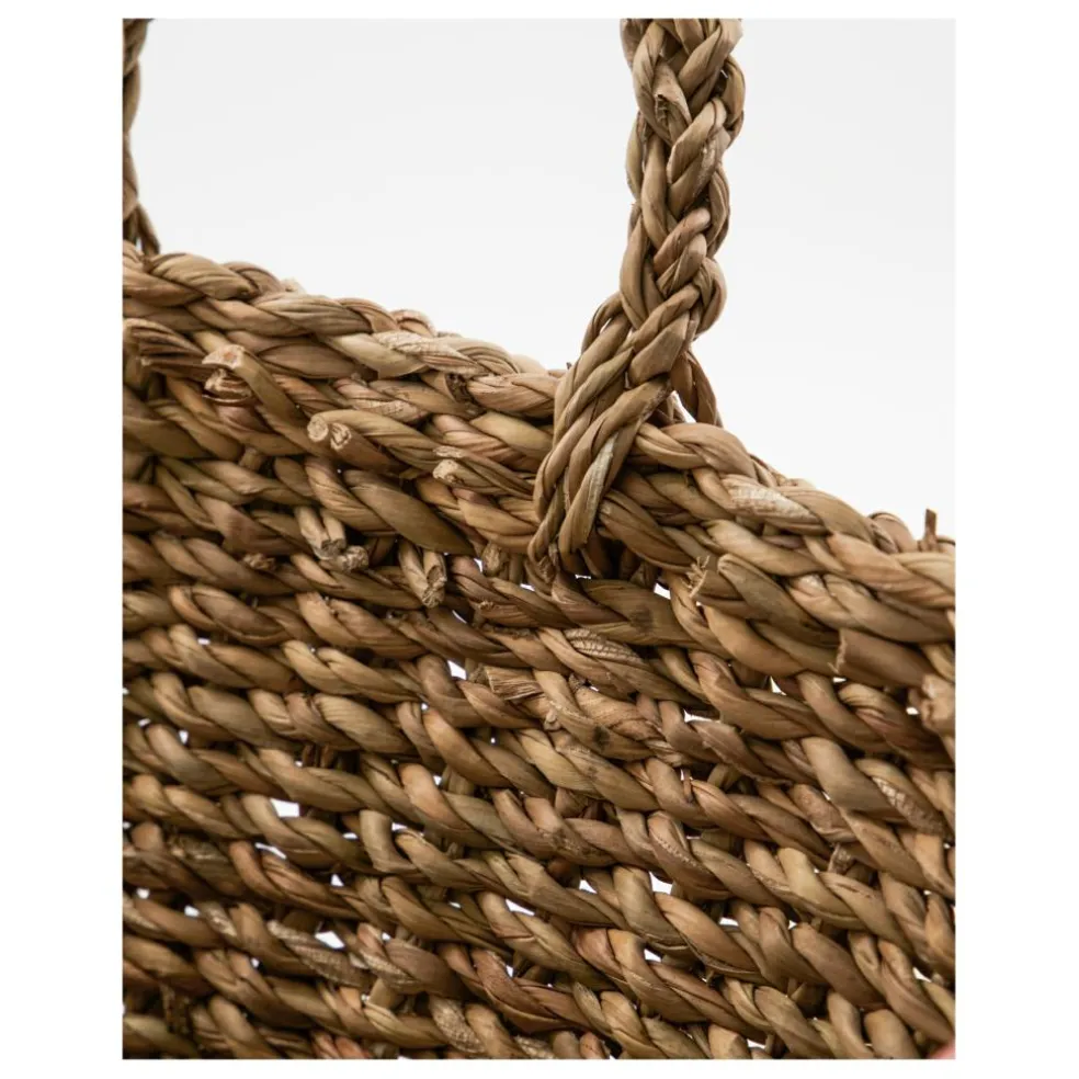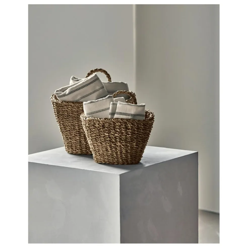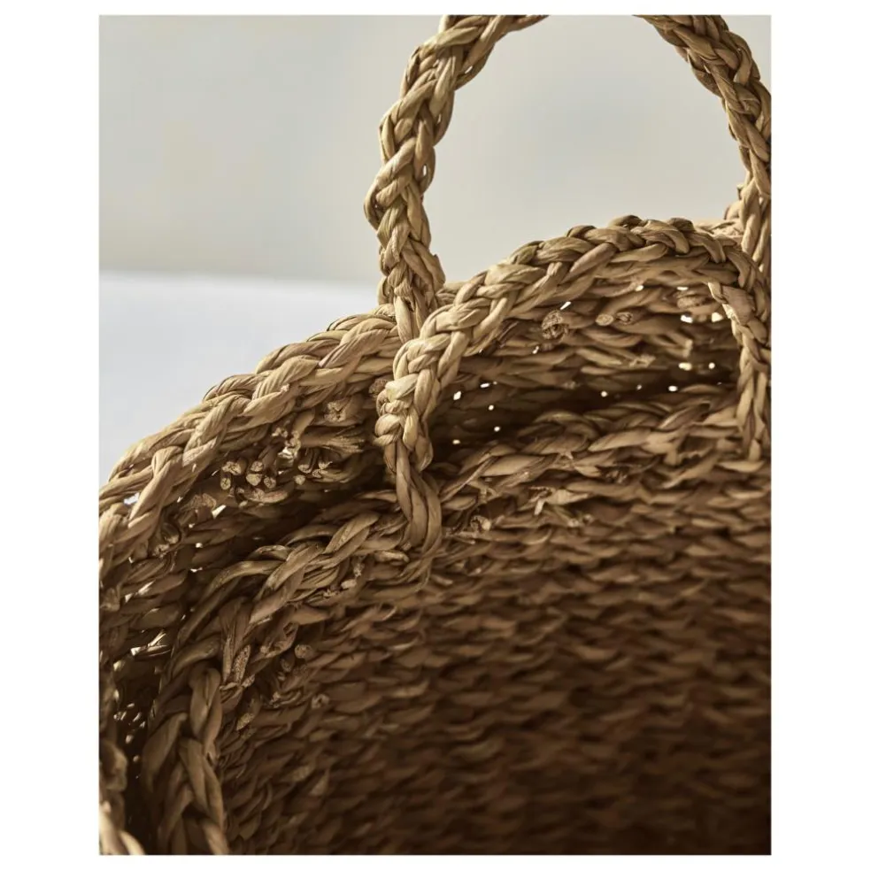 Håndflettede detaljer og praktiske hanke gør det let at hænge dem på knager i badeværelse, soveværelse eller køkken.