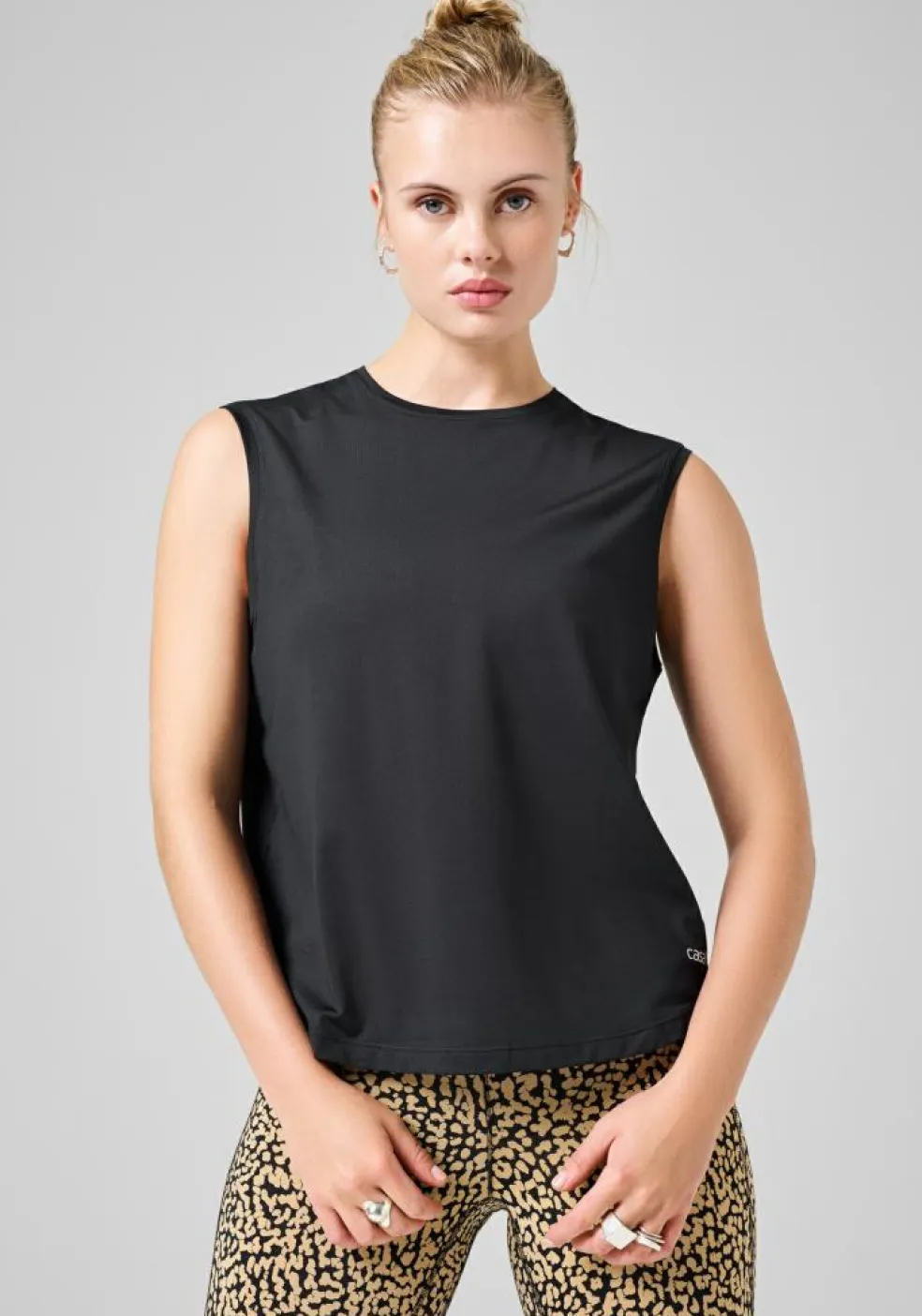 Toppen har en løs pasform med høj halsudskæring og let faldende ærmegab for et afslappet look.