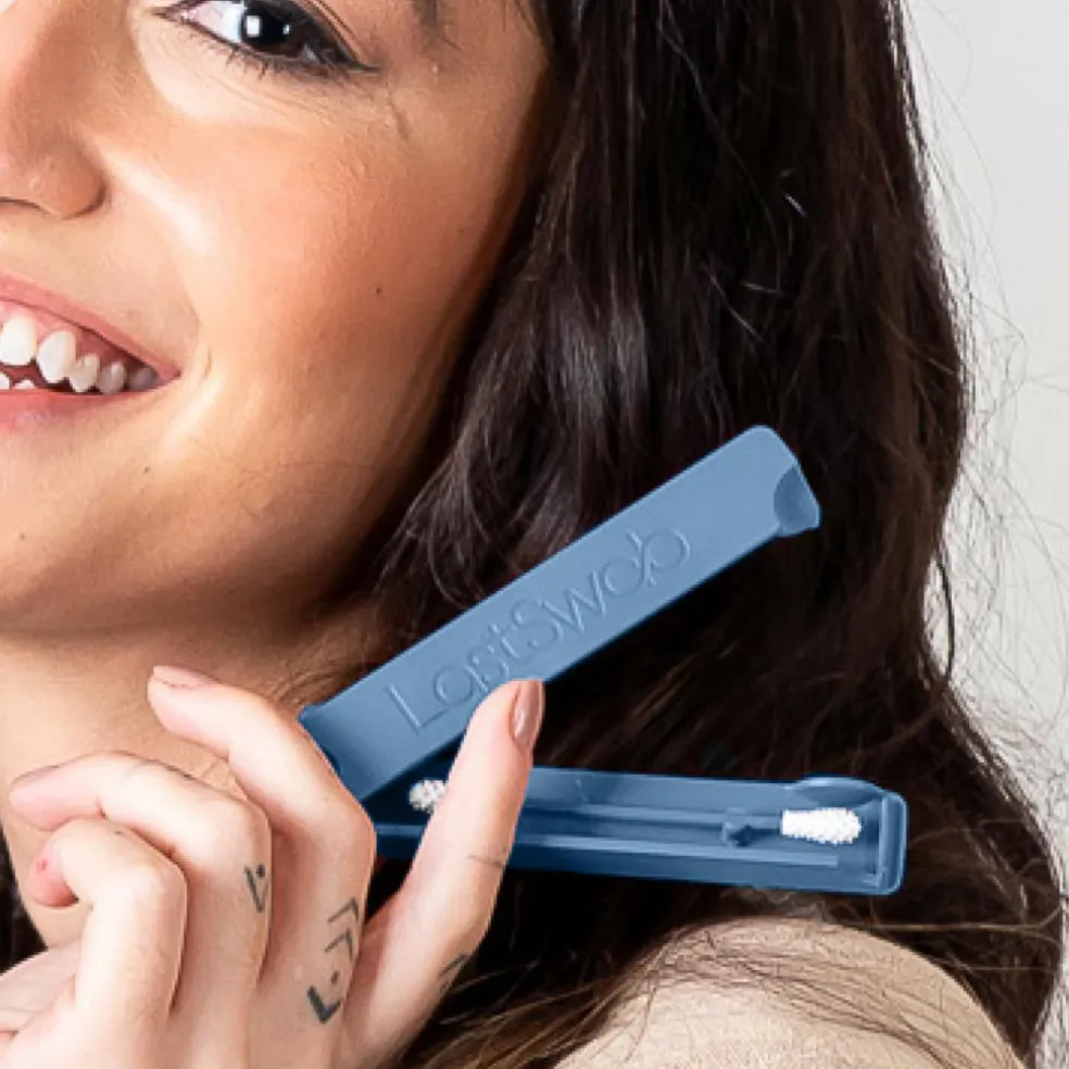 Den kommer i en case lavet af genanvendt havplast, som holder din LastSwab hygiejnisk og ren, uanset om du har den i kufferten, håndtasken eller på dit badeværelse. Spidserne har en nubret overflade, som er lavet af medicinsk TPE, som føles behageligt og er god til at opsamle uønskede partikler.