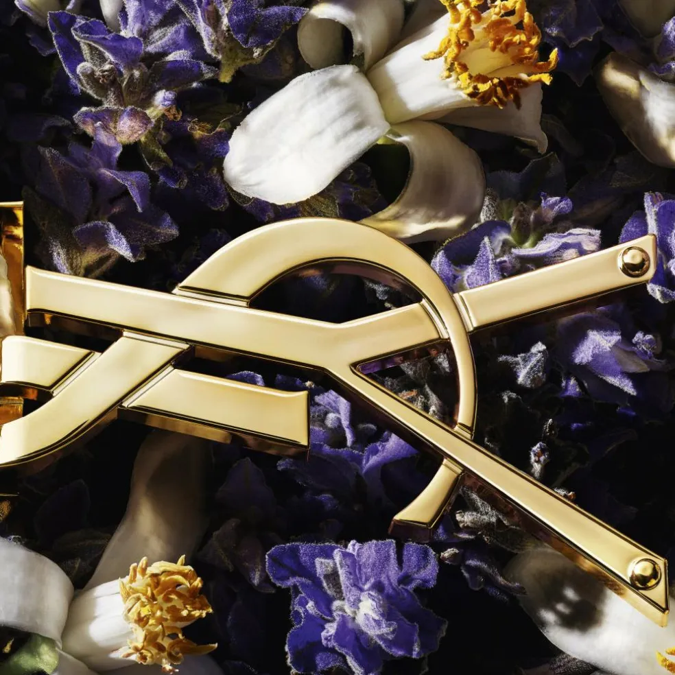 Yves Saint Laurents ikoniske logo af Cassandre er frit bøjet og fastgjort til glasset som en juvel.