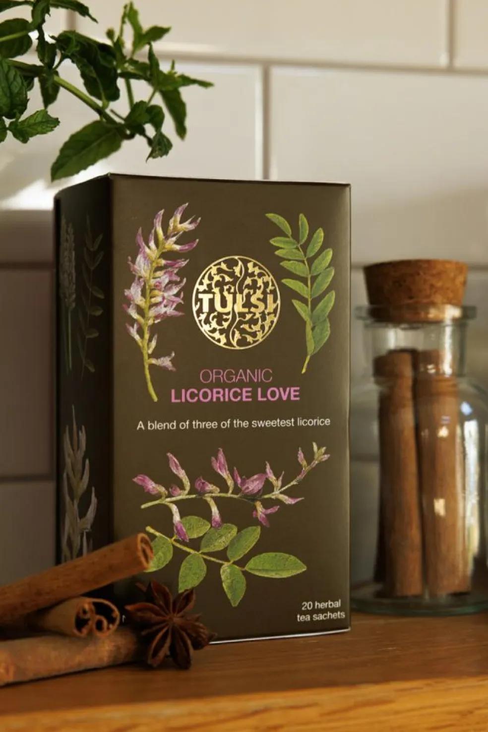 Elskede du Three Licorice fra Pukka, kan du her finde dig en ny favorit. Alle teer fra Tulsi er økologisk certificeret, med ingredienser fra højkvalitets avlere. Teposerne er fremstillet af en særlig blanding af naturlige abaca fibre, træpulp og plantecellulosefibre – naturligt fri for mikroplast. Foldet og syet med en økologisk certificeret bomuldsnor.