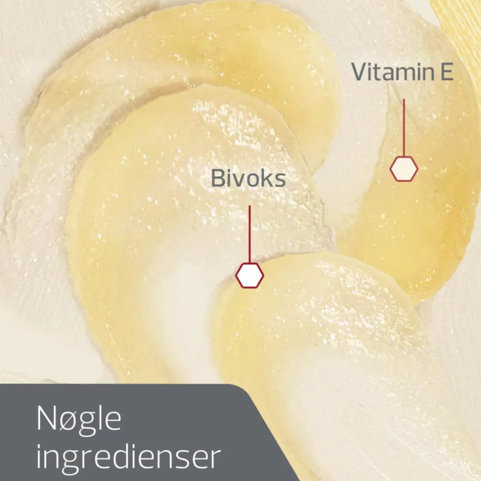 Formuleret med bivoks og vitamin E, som plejer og støtter genoprettelsen af tørre læber og tørre områder på kroppen.