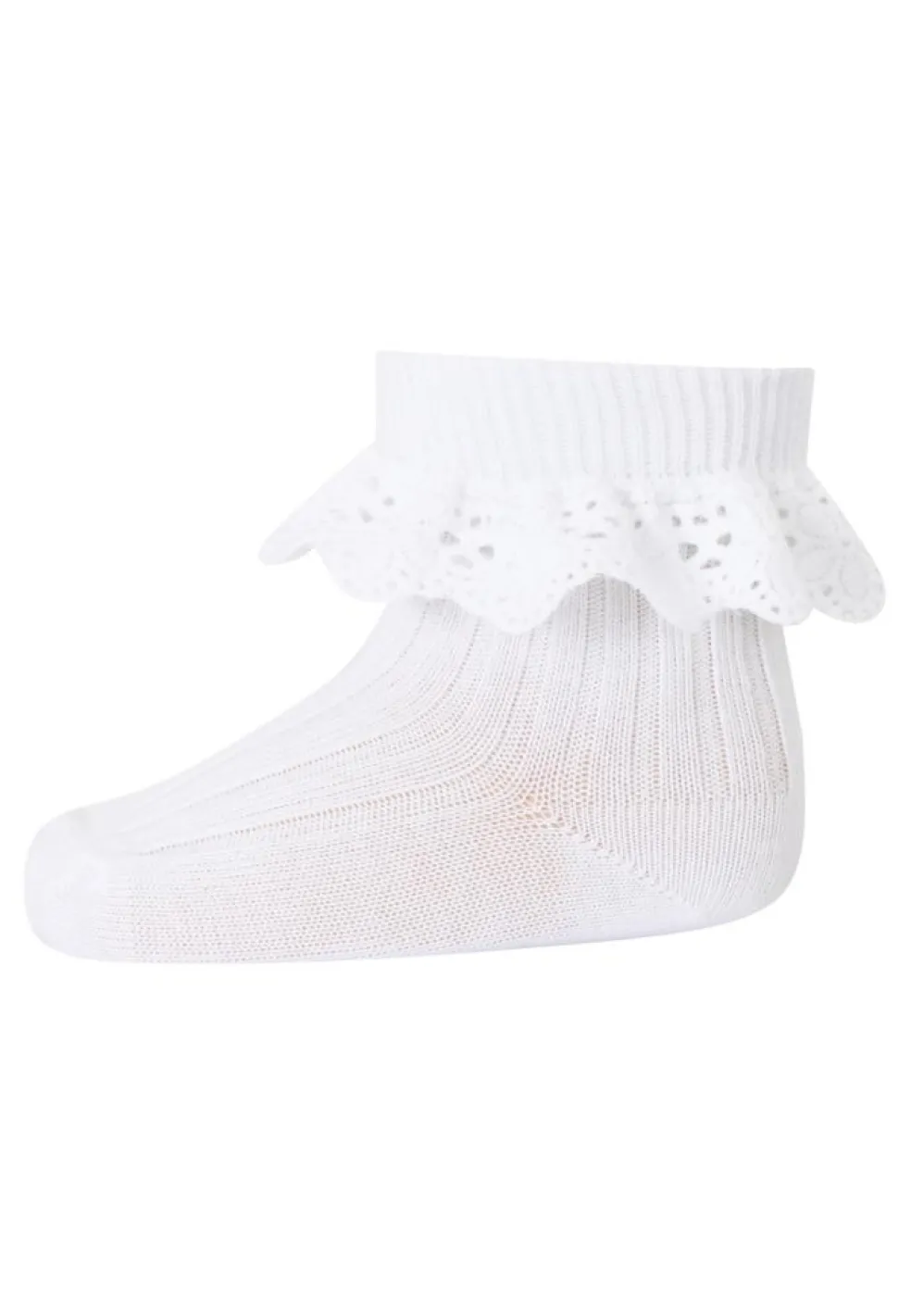 Øverst i kanten har sokken en dekorativ blondekant og en fold.