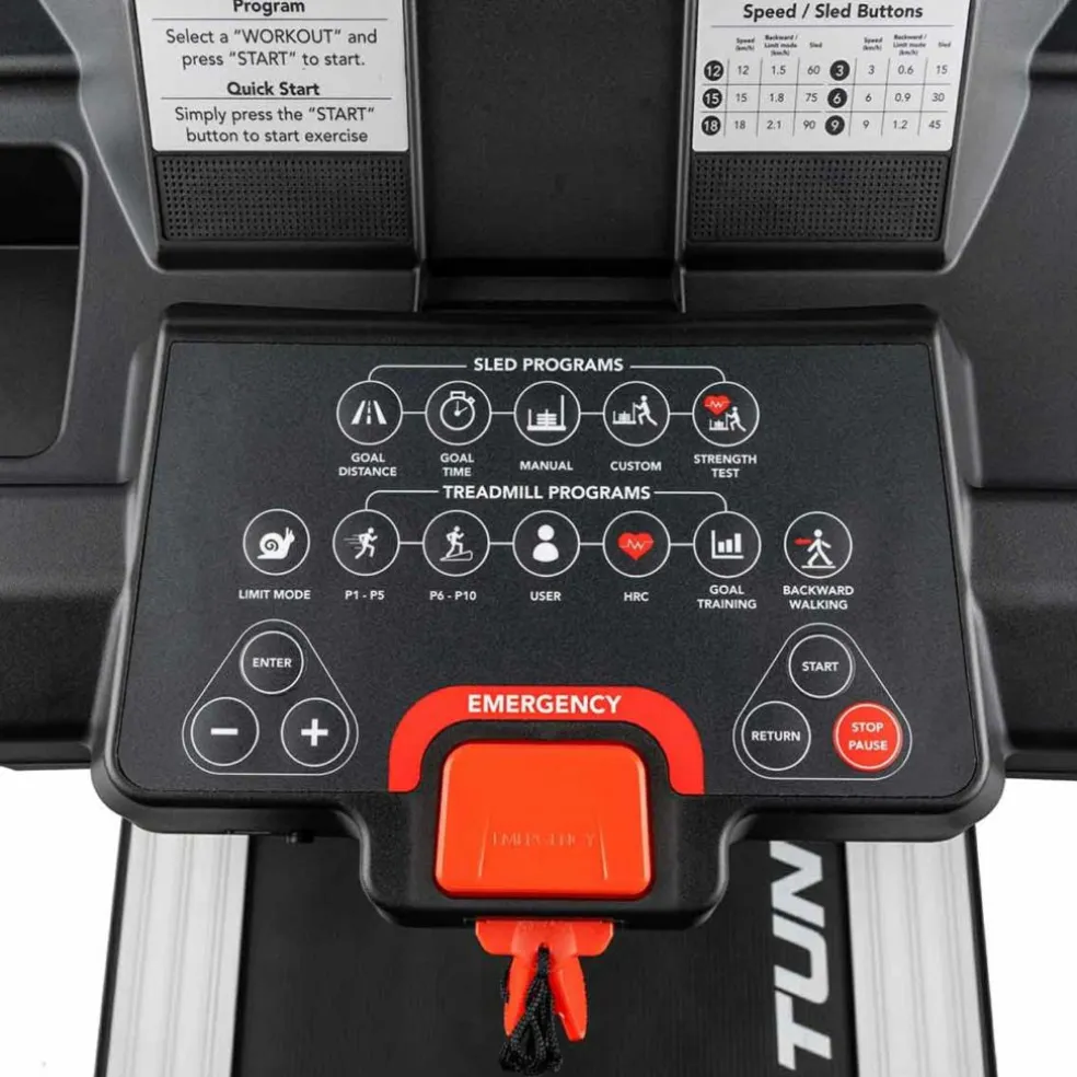 ette løbebånd tilbyder mere end bare løb. Med muligheden for kraftslædetræning og genoptræning er det en komplet træningsløsning. Brug core stangen foran på løbebåndet til at skubbe eller trække, hvis du går baglæns.