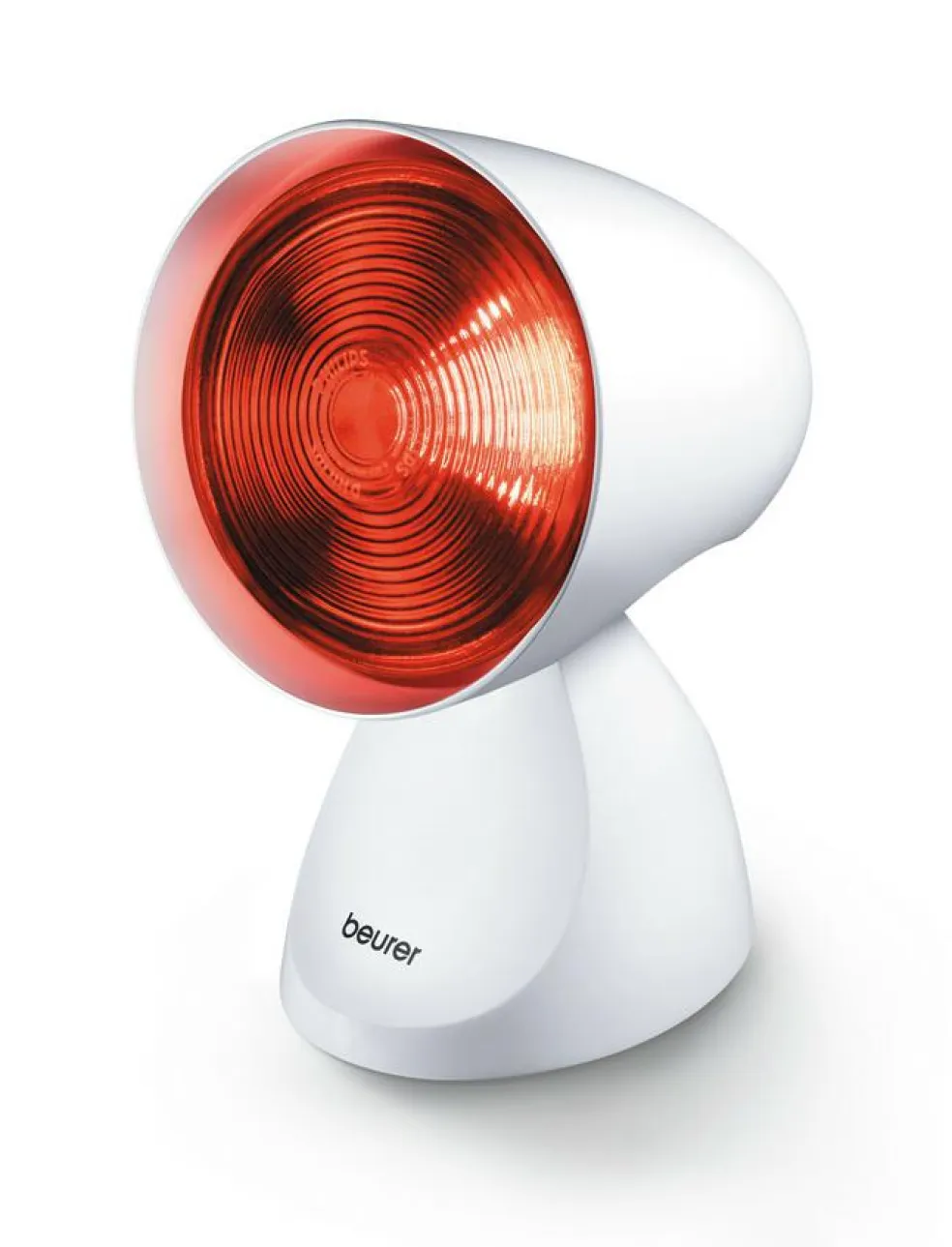 Infrarød lampe fra Beurer. Varmen fra den infrarøde lampe trænger dybt ind i huden og øger blodcirkulationen. Lampen er god til lindring af mange forskellige symptomer som fx. pandehulebetændelse, forkølelse, muskel- og ledsmerter, mælkeknuder m.m.