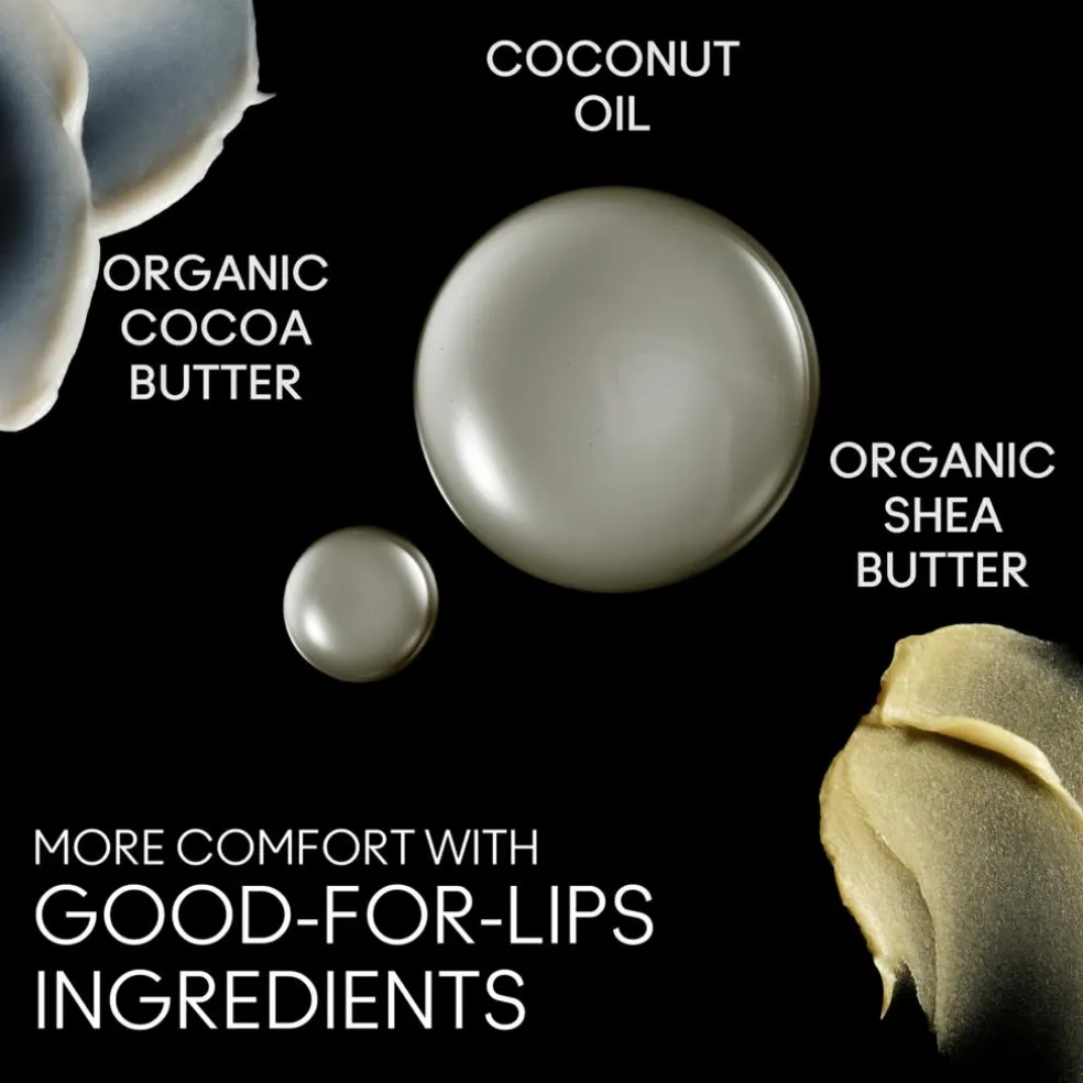 KOMFORT med en cremet blanding af kokosolie, økologisk sheasmør og økologisk kakaosmør, der plejer og nærer læberne.