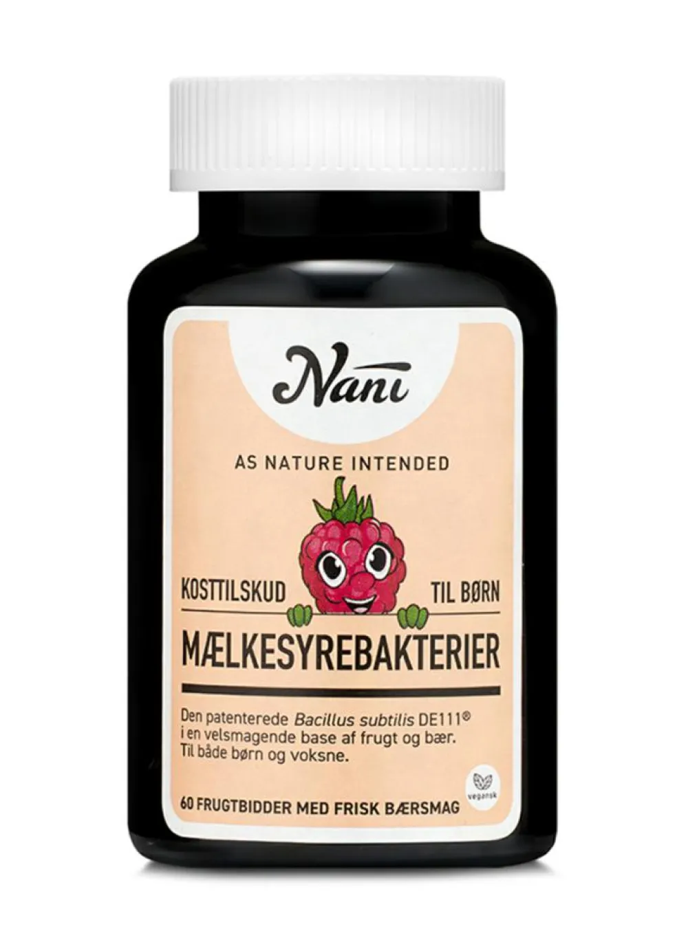 Produktet består udelukkende af naturlige ingredienser og er en lille frugt bid der indeholder hele 96,5% frugt og bær, med 1 mia. levende bakterier (den patenterede stamme Bacillus subtilis DE111®.)