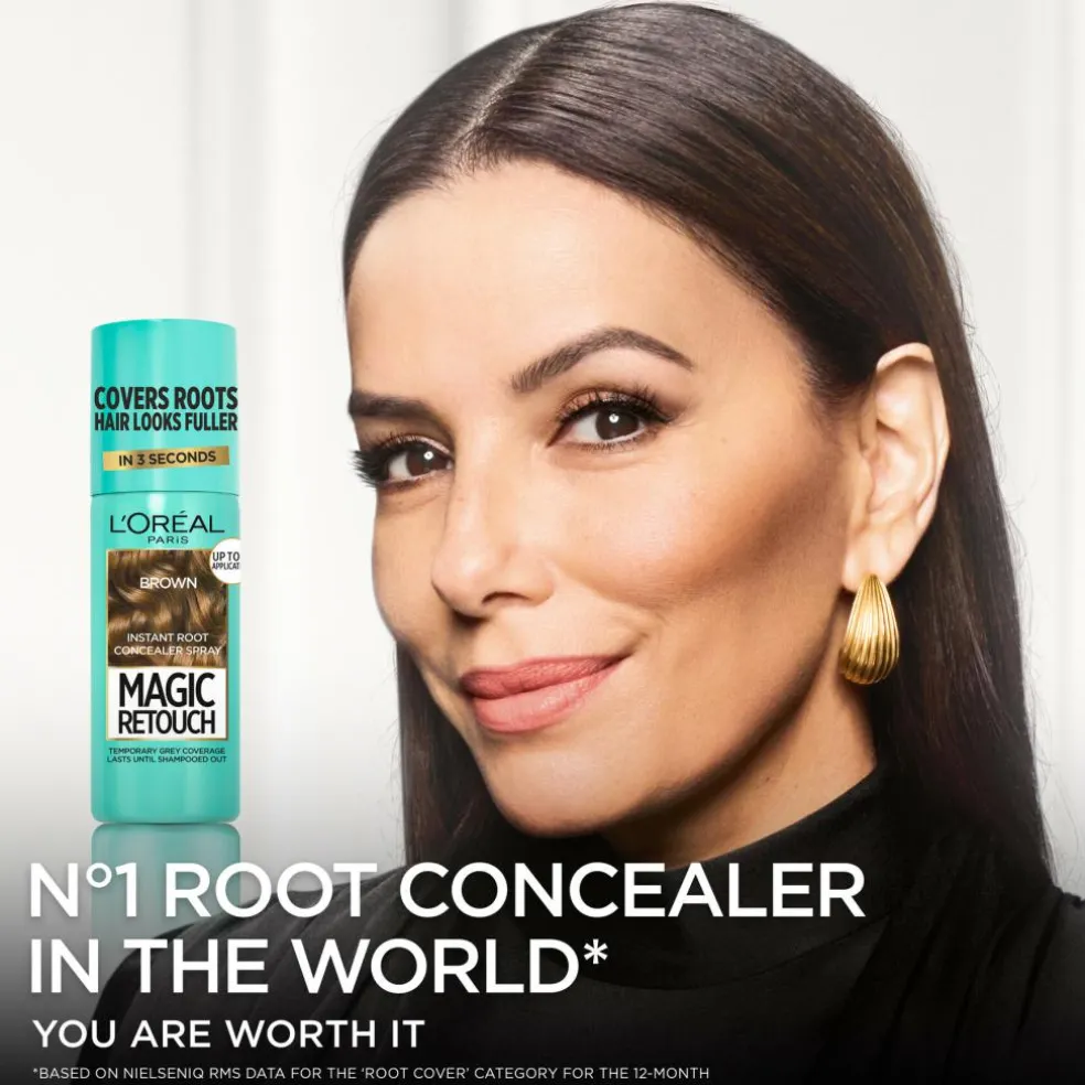 En hurtigtørrende spray, der er specielt udviklet til effektivt at skjule grå udgroning i brunt hår.