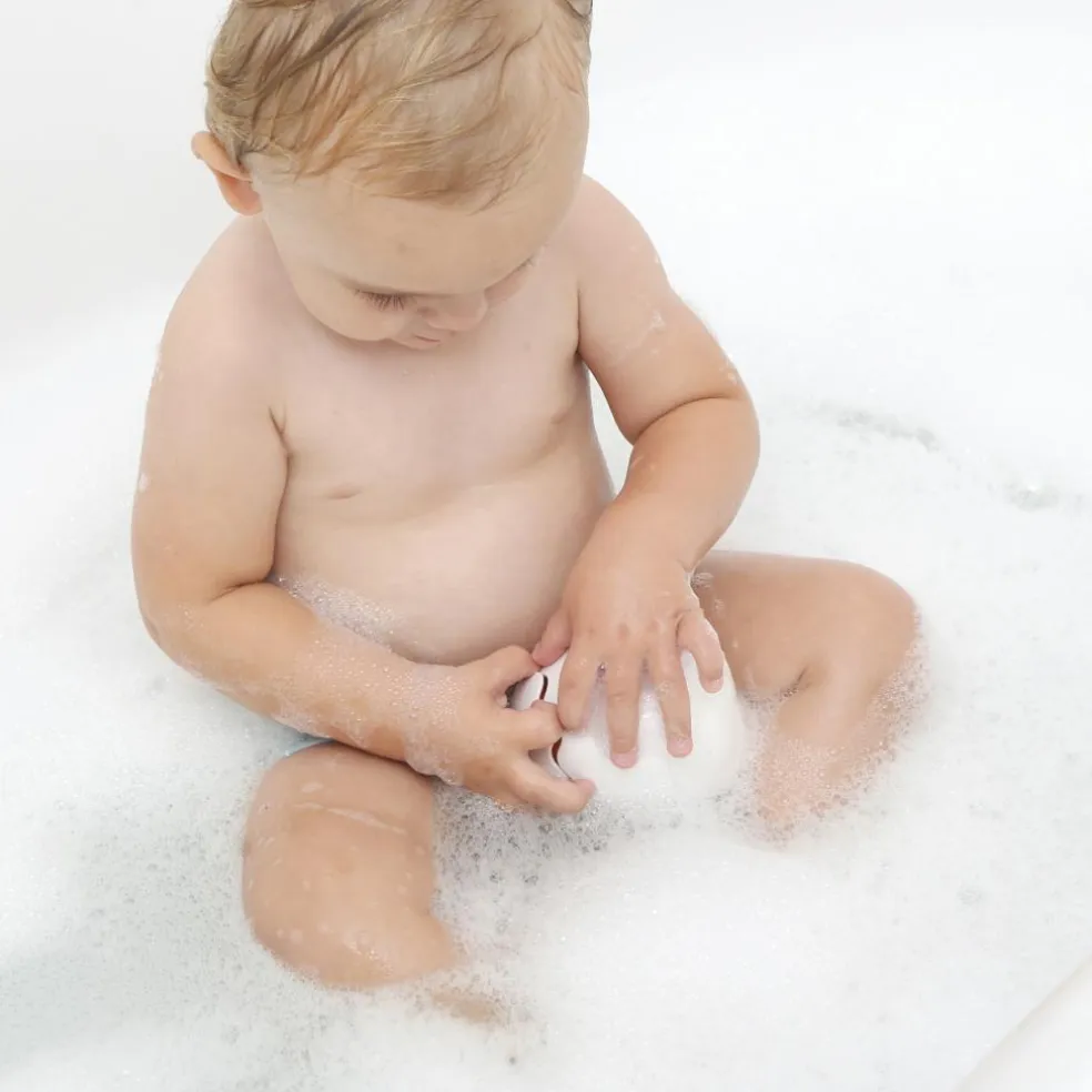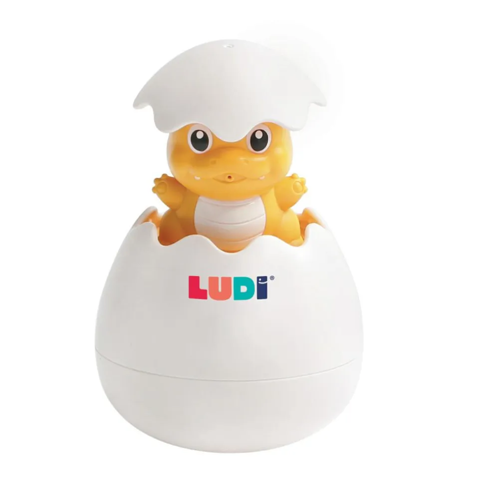 Dinoen stikker genert hovedet ud af skallen under vand og som en overraskelse for barnet regner det som et brusebad under ægget, når det kommer op af vandet.