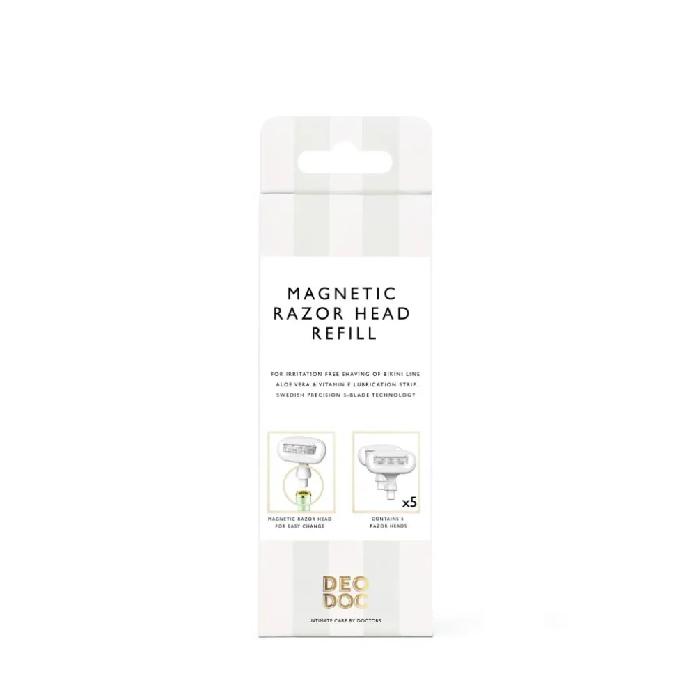 Magnetic Razor Head Refill fra DeoDoc indeholder 5 magnetiske barberblade, specielt udviklet til at give en blid og tæt barbering. De magnetiske hoveder gør det nemt og sikkert at skifte blade, samtidig med at de sikrer at barberbladene ikke løsner sig under brug. Disse barberblade er kompatible med DeoDoc Intimate Shaving Razor og er ideelle til en glat og behagelig barberingsoplevelse.