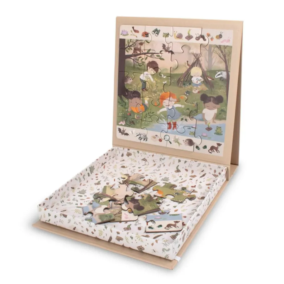 Vores magnetiske myldrepuslespil med den fine skovillustration gør det nemt at tage dit yndlingsspil med på farten, for takket være den stabile æske med den magnetiske plade bliver dine brikker på deres pladser.