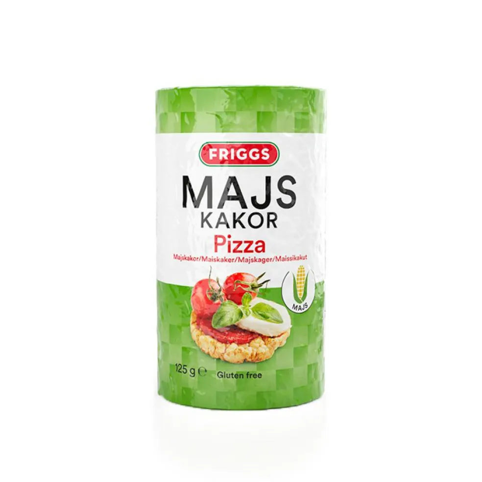 Friggs majskager pizza er glutenfri majskager, med en mild og lækker smag af pizza. Velegnet til mellemmåltid eller snacks uanset hvor du er.