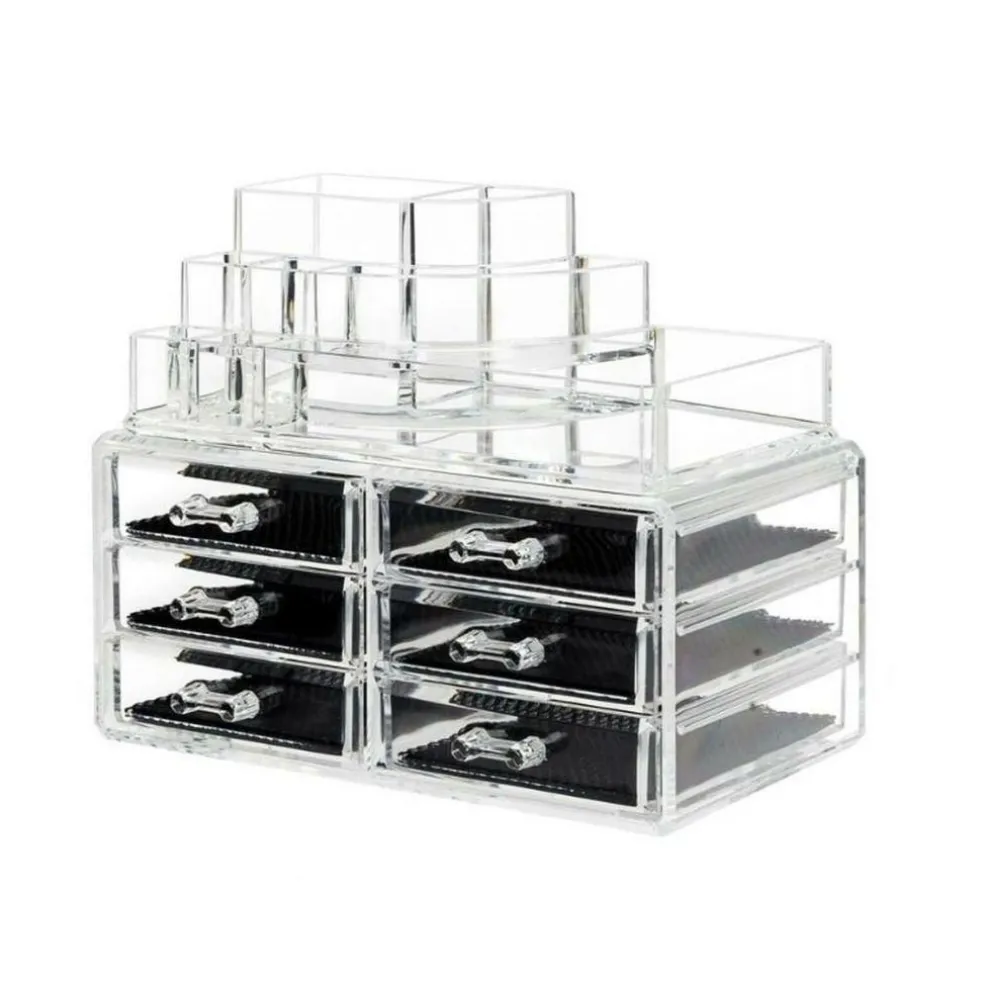 Denne makeup organizer er designet med seks praktiske skuffer i forskellige størrelser, samt rum i toppen, hvilket giver dig masser af opbevaringsplads. Det transparente design gør det let at se, hvad der er i hver skuffe, så du sparer tid og undgår rod.