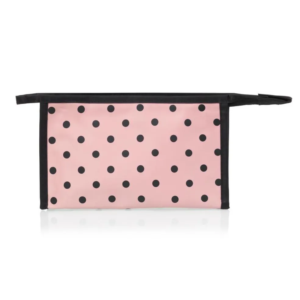 Smart lille A-formet makeup pung fra Studio. Makeup pungen har rosa print med sorte prikker, og et lynlås rum med plads til dine mest essentielle produkter.