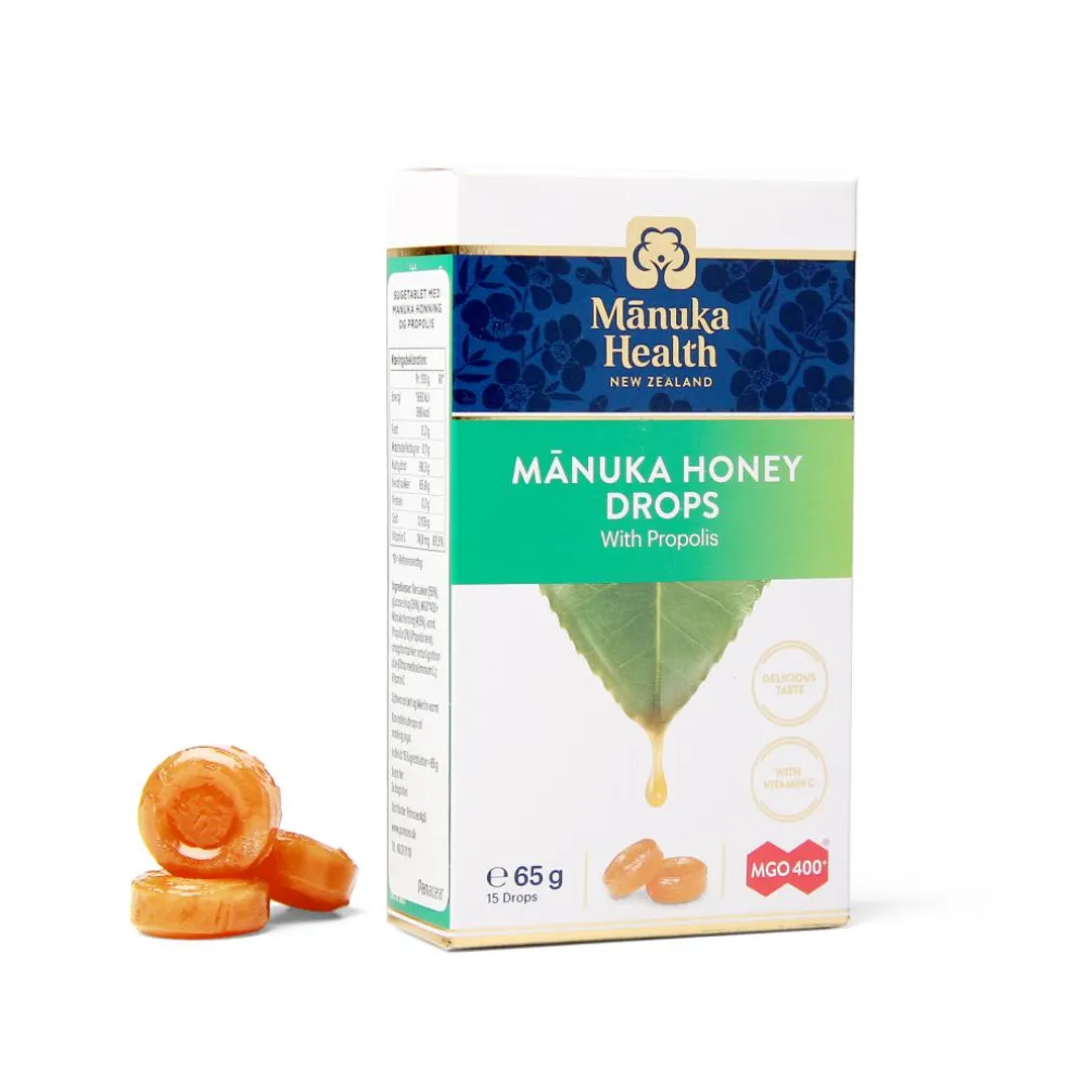 Disse lækre sugetabletter fra Manuka Health kombinerer ren New Zealandsk Manuka Honning sammen med propolis. Sugetabletterne er lavet med MGO 400+ Manuka Honning.