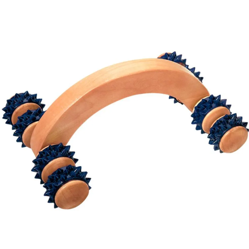 Massagerulle i træ med mørkeblå knopper fra Croll og Denecke. Massagerullen hjælper med at løsne musklerne og med at stimulere blodcirkulationen.