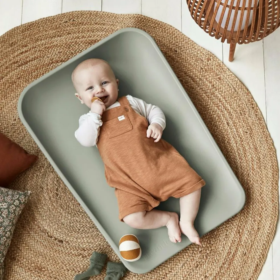 Matty™ puslepuden er slidstærk og udstyret med en træplade på undersiden, der sikrer, at den står stabilt. Det betyder, at du uden problemer kan placere den på f.eks. en puslekommode, et bord eller direkte på gulvet. På bagsiden har puslepuden fire små gummifødder, der gør den skridsikker og samtidig sikrer ventilation, så underlaget under puslepuden ikke bliver fugtigt og efterlader mærker. Overfalden på puslepuden er samtidig vandafvisende, nem at rengøre og kan desuden desinficeres.