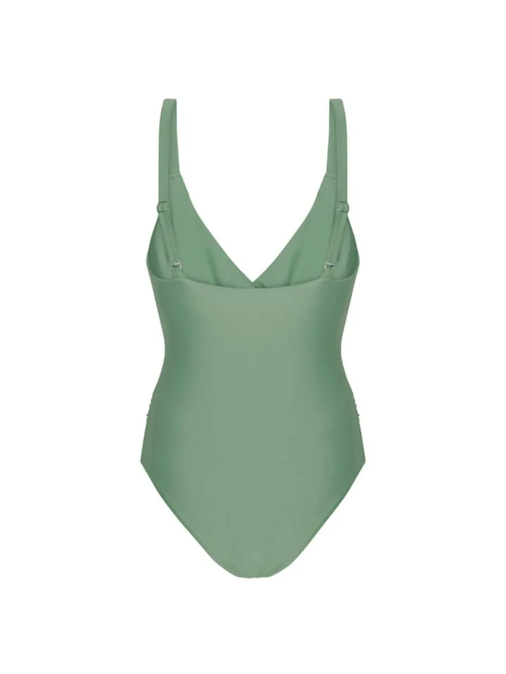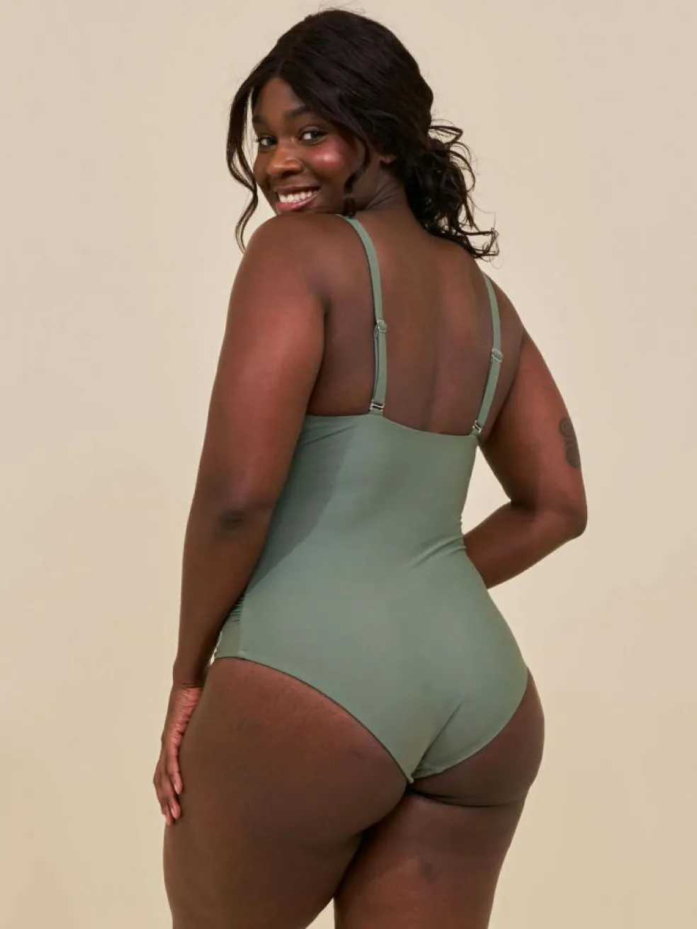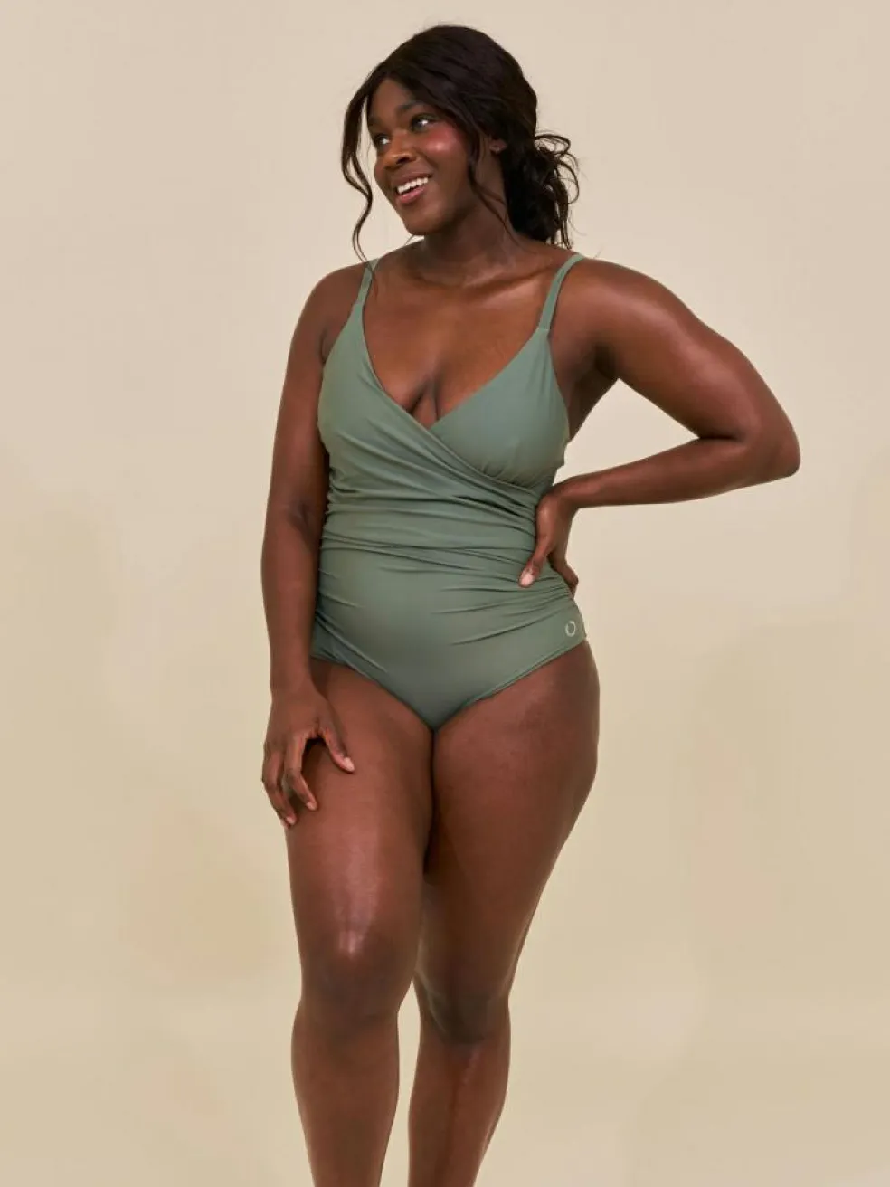 Medewi draperet badedragt er skabt af regenereret nylon mixet med elastan, som skaber et materiale der smyger sig om kroppen og giver støtte.