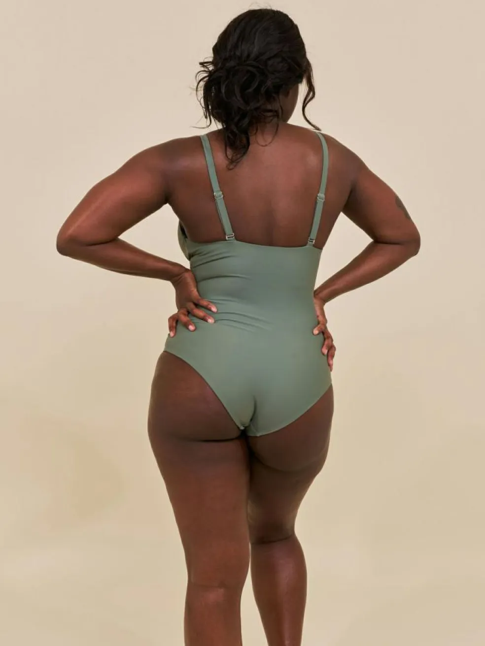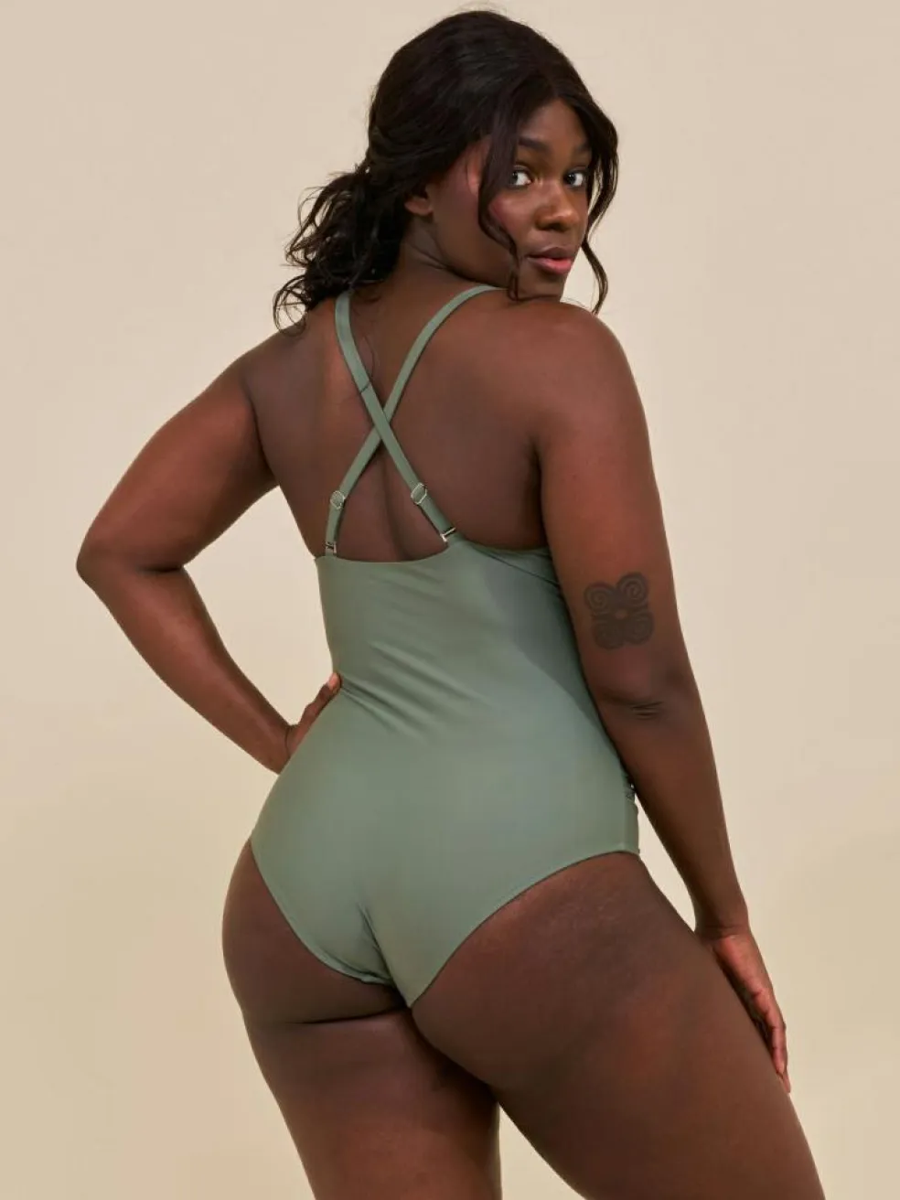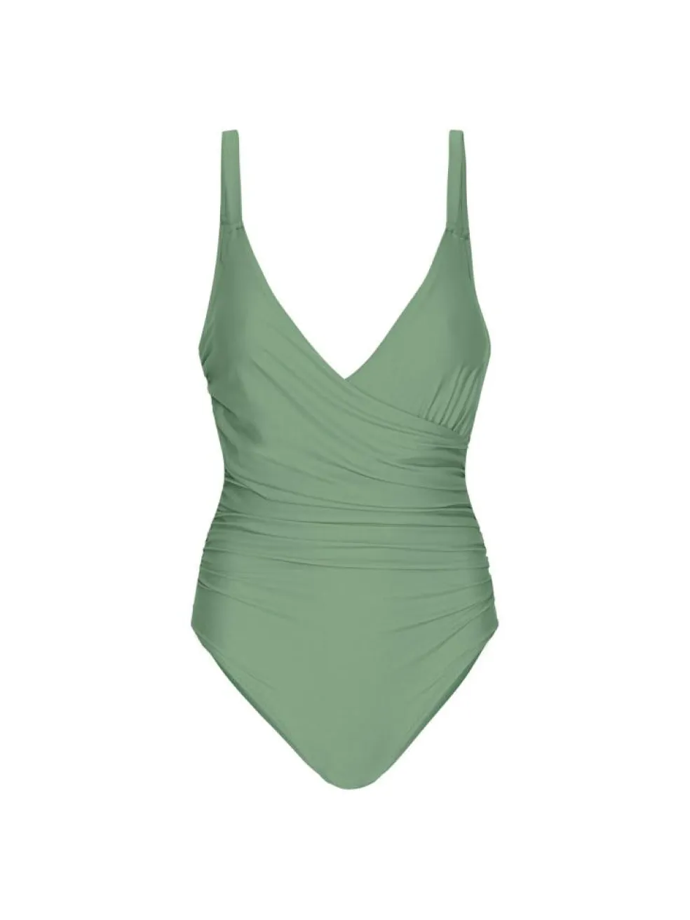 Medewi draperet badedragt er skabt af regenereret nylon mixet med elastan, som skaber et materiale der smyger sig om kroppen og giver støtte.