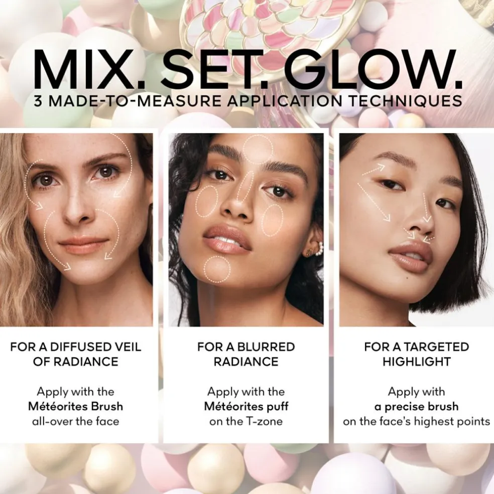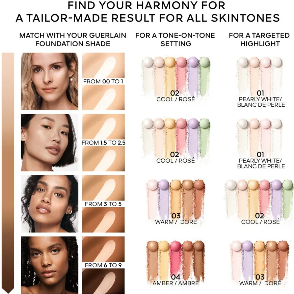 For en hudtone med en målrettet glød, har jeg præcist udvalgt de forskellige farver af Météorites Pearls, med fokus på undertoner og små variationer af nuancer, der karakteriserer hver type hudtone.