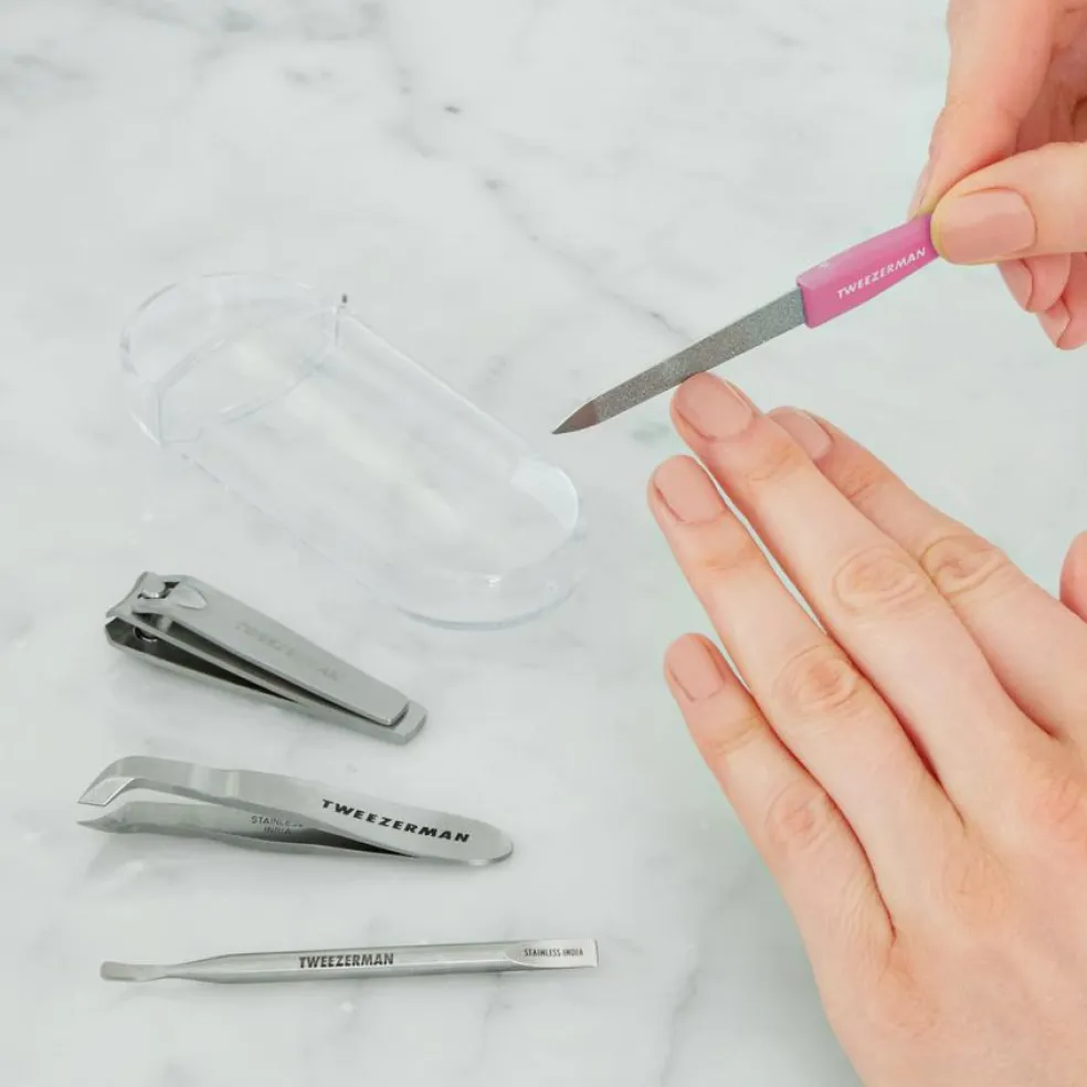- 4. Afslut ved blidt at forme og file neglene med The Pocket Nail File.