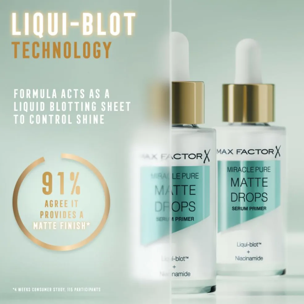 Den dermatologisk testede, veganske formel indeholder Liqui-Blot Technology™, som fungerer som et flydende blotting paper og reducerer glans for en blød, mat finish.
