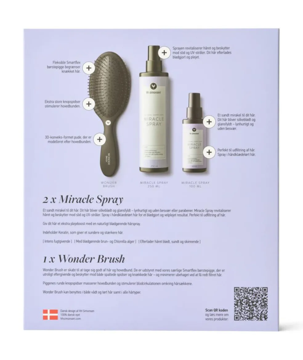 Oplev øjeblikkelig glans og pleje med Miracle Spray – en effektiv leave-in hårspray, der blødgør, fugter og beskytter håret uden at skulle skylles ud. Den er rig på plejende ingredienser og tilfører intens fugt, samtidig med at den beskytter håret mod slitage og solens skadelige UV-stråler. Miracle Spray gør håret nemmere at rede ud og efterlader det silkeblødt og glansfuldt – perfekt som forberedelse inden børstning. Velegnet til alle hårtyper.