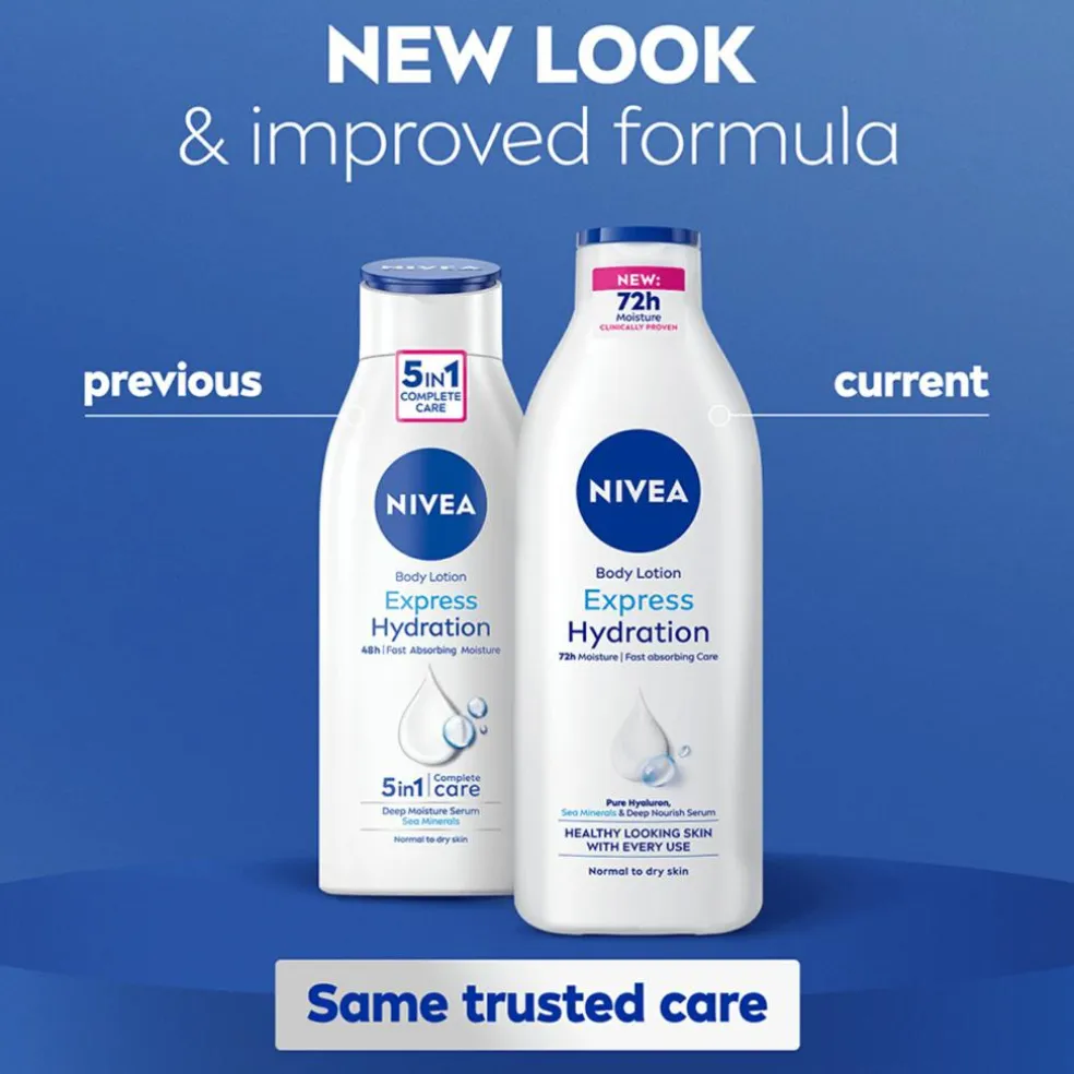 Forvandl din tørre hud med NIVEA® Express Hydration Body Lotion. Giver 5 i 1 komplet pleje: 1. 48 timers dyb fugt, 2. Blød hudfølelse, 3. Hurtigabsorberende, 4. Skønsom pleje og 5. Sund hud. Denne hudlotion beskytter huden, samtidig med at den giver hurtig absorberende fugt. Beriget med en kombination af plejende ingredienser, herunder NIVEAs Deep Moisture Serum. Nogle hudområder tørrer hurtigere ud end andre. Derfor er det vigtigt at give huden ekstra pleje året rundt, således din hud får alt, hvad den fortjener. Påfør denne NIVEA lotion dagligt over hele kroppen. Denne NIVEA hudpleje er dermatologisk testet. Velegnet til alle hudtyper, også dem med tør hud.